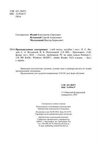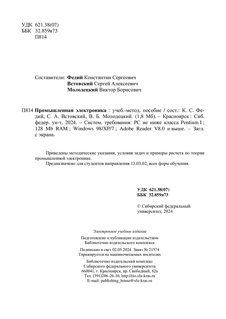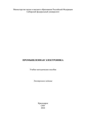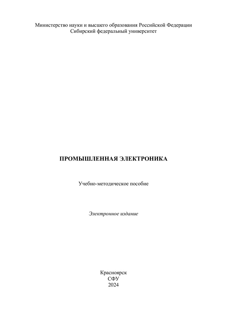 Библиографическое описание:Промышленная электроника : учебно-методическое пособие / Сиб. федер. ун-т, Политехн. ин-т ; сост.: К. С. Федий, С. А. Встовский, В. Б. Молодецкий. - Электрон. текстовые дан. (pdf, 1,9 Мб). - Красноярск : СФУ, 2024 (2024-05-02). - 101 с. - Загл. с титул. экрана. - Изд. № 2024-21574 : Б. ц. - Текст : электронный.