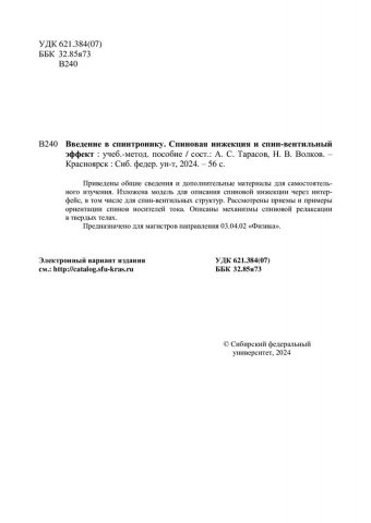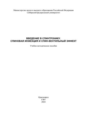 Библиографическое описание: Введение в спинтронику. Спиновая инжекция и спинвентильный эффект : учебно-методическое пособие / Сибирский федеральный университет ; сост.: А. С. Тарасов, Н. В. Волков. - Электрон. текстовые дан. (1,6 Мб). - Красноярск : СФУ, 2024 (2024-10-31). - 56 с., 3.0 усл. печ. л. - Загл. с титул. экрана. - Электрон. версия печ. публикации . - Библиогр.: с. 54-55. - 100 экз. - Изд. № 2024-22977 : Б. ц. - Текст : электронный.