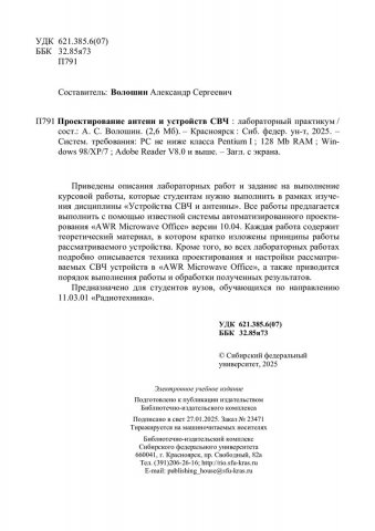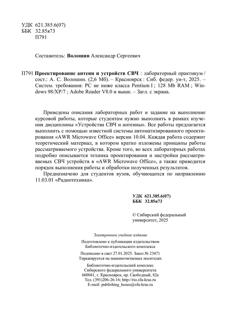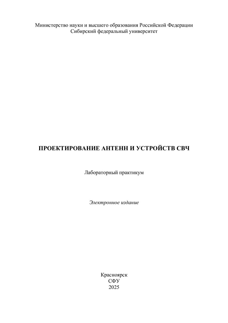 Библиографическое описание: Проектирование антенн и устройств СВЧ : лабораторный практикум / Сибирский федеральный университет, Институт инженерной физики и радиоэлектроники ; сост. А. С. Волошин. - Электрон. текстовые дан. (pdf, 2,3 Мб). - Красноярск : СФУ, 2025 (2025-01-27). - 64 с. - Загл. с титул. экрана. - Библиогр.: с. 63-64. - Изд. № 2024-23471 : Б. ц. - Текст : электронный.