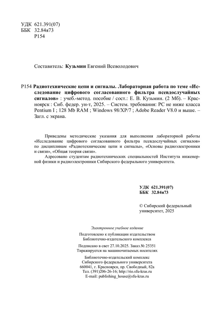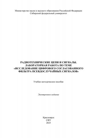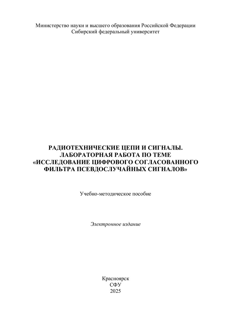Библиографическое описание:Радиотехнические цепи и сигналы. Лабораторная работа по теме "Исследование цифрового согласованного фильтра псевдослучайных сигналов" : учебно-методическое пособие / Сибирский федеральный университет, Институт инженерной физики и радиоэлектроники ; сост. Е. В. Кузьмин. - Электрон. текстовые дан. (pdf, 4.9 Мб). - Красноярск : СФУ, 2025 (2025-10-27). - 23 с. - Загл. с титул. экрана. - Библиогр.: с. 22. - Изд. № 2025-25351 : Б. ц. - Текст : электронный.