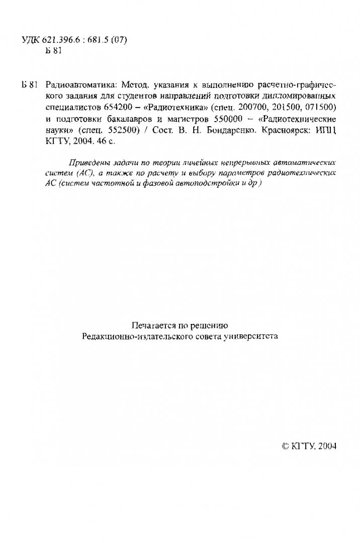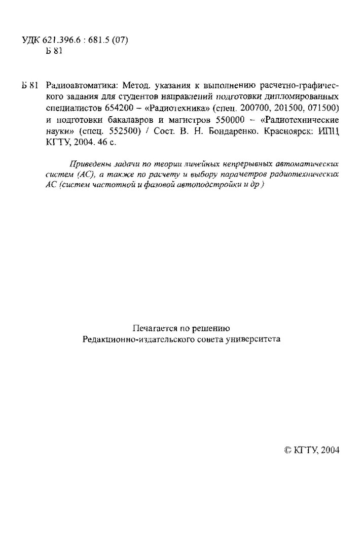 Библиографическое описание:Бондаренко, Валерий Николаевич. Радиоавтоматика : метод. указ. к выполнению расчетно-графич. задания для студентов направлений подгот. дипломир. спец. 654200 и подгот. бакалавров и магистров 550000 / В. Н. Бондаренко ; Краснояр. гос. техн. ун-т. - Красноярск : ИПЦ КГТУ, 2004. - 46 с. - (Учебно-методическая литература). - Текст : непосредственный + Текст : электронный.