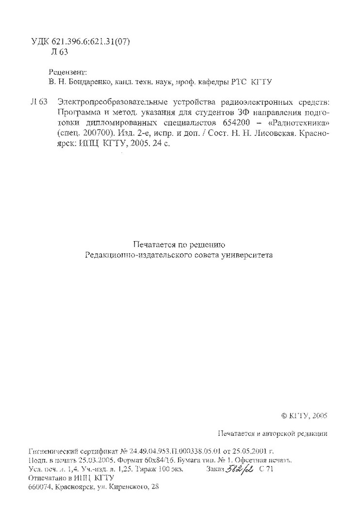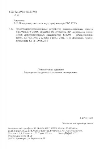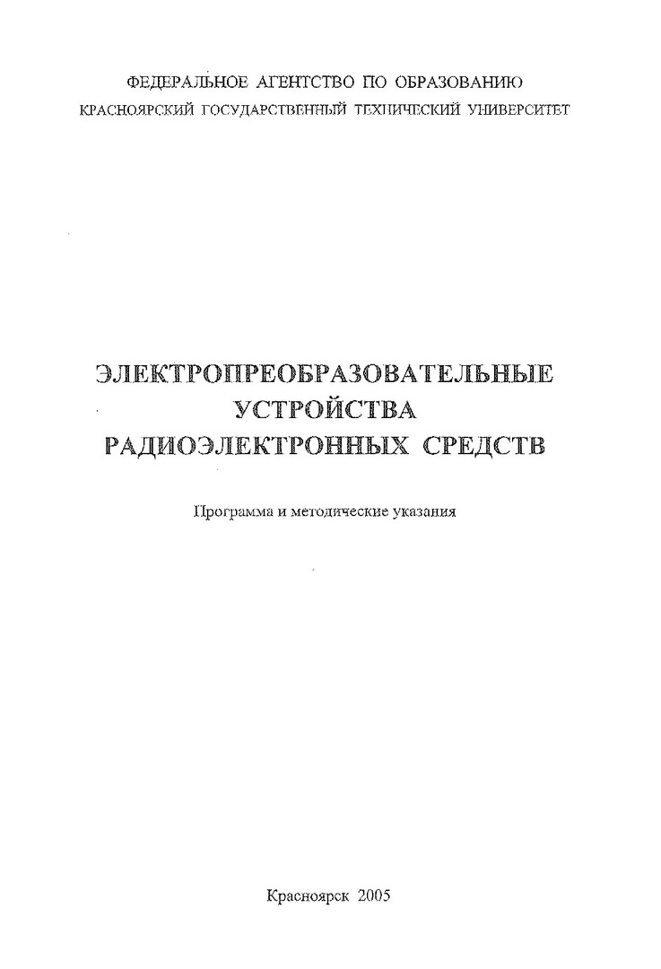 Библиографическое описание:Лисовская, Наталья Николаевна. Электропреобразовательные устройства радиоэлектронных средств : Программа и метод. указ. для студентов ЗФ направления подгот. дипломир. спец. 654200 / Н. Н. Лисовская ; Краснояр. гос. техн. ун-т. - 2-е изд., испр. и доп. - Красноярск : ИПЦ КГТУ, 2005. - 24 с. - (Учебно-методическая литература). - 14.00 р. - Текст : непосредственный + Текст : электронный.