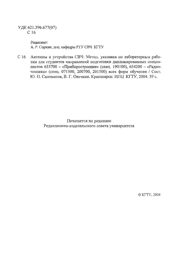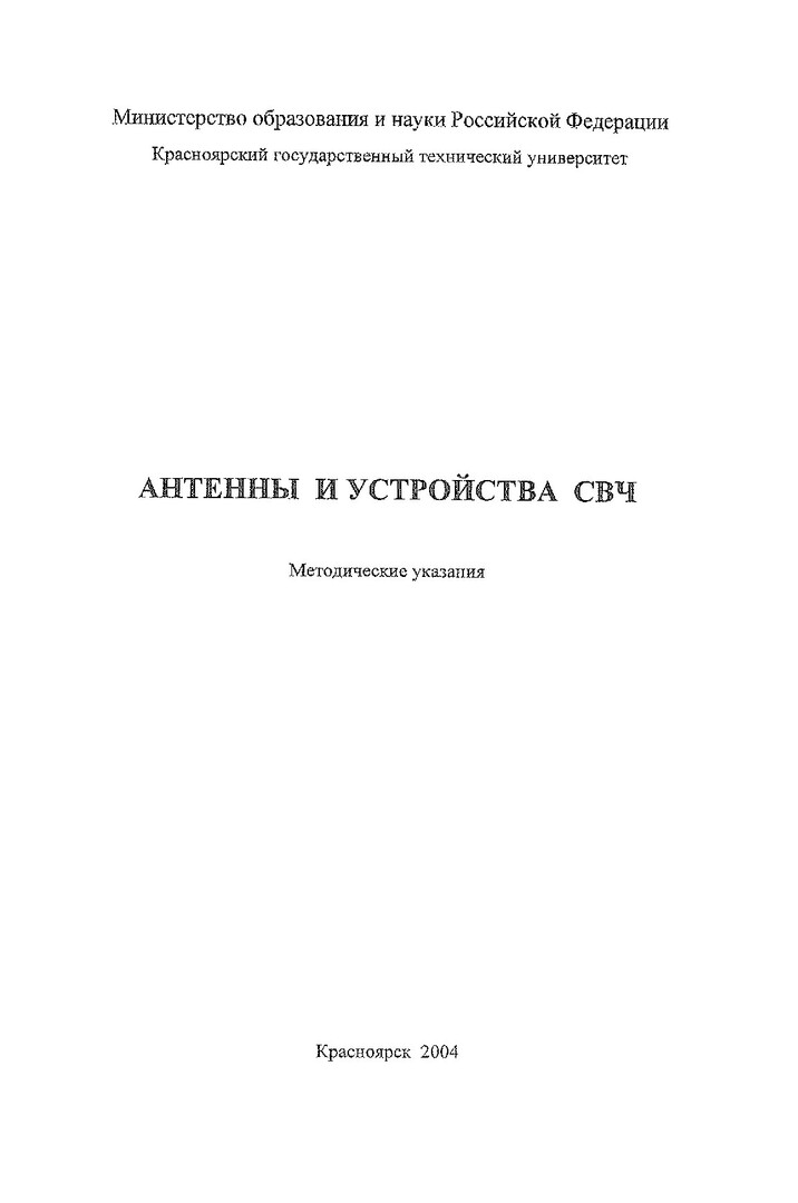 Библиографическое описание:Саломатов, Юрий Петрович. Антенны и устройства СВЧ : методические указания по лабораторным работам для студентов напр. подготовки дипломированных специалистов 653700, 654200 всех форм обучения / Ю.П. Саломатов, В.Г. Овечкин ; Краснояр. гос. техн. ун-т. - Красноярск : ИПЦ КГТУ, 2004. - 39 с. - (Учебно-методическая литература). - 6.60 р. - Текст : непосредственный + Текст : электронный.