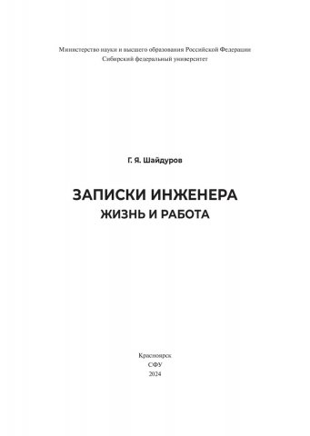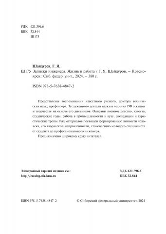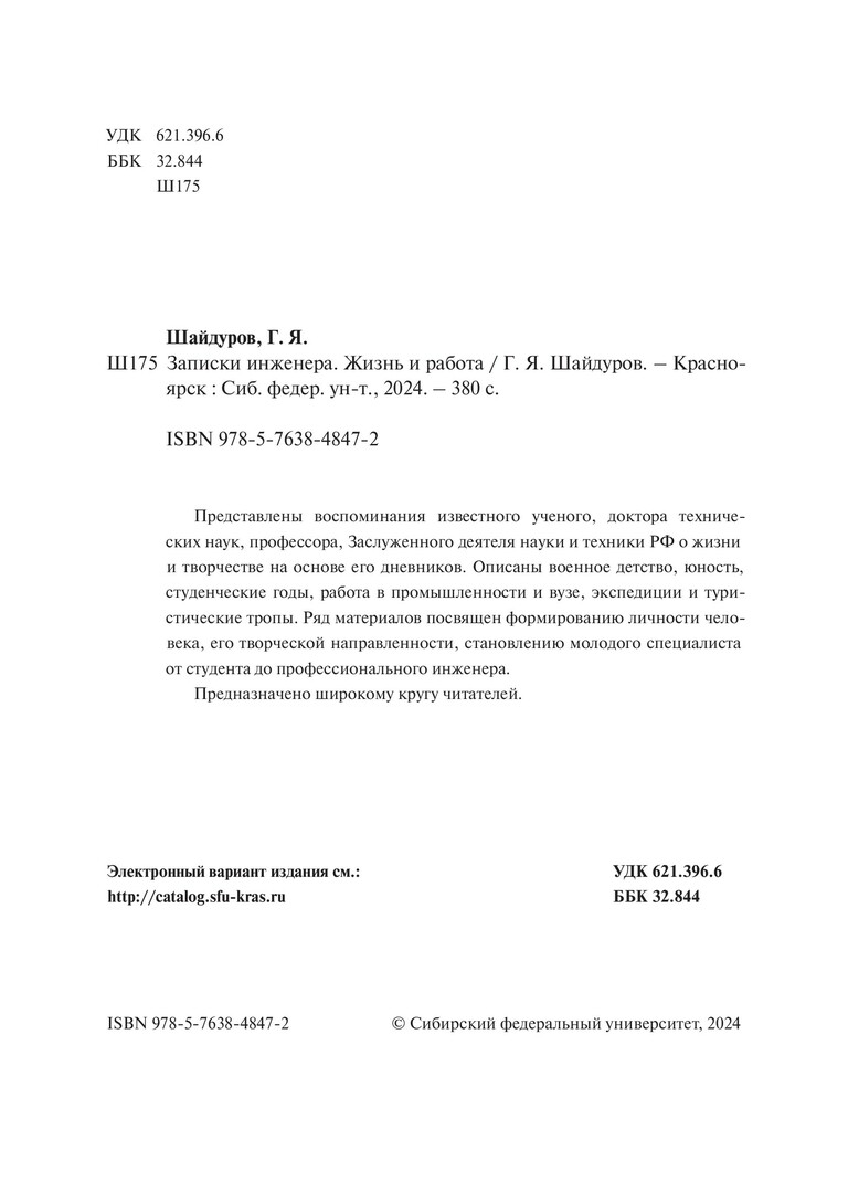 Библиографическое описание: Шайдуров, Георгий Яковлевич. Записки инженера: жизнь и работа / Г. Я. Шайдуров ; Сибирский федеральный университет, Военно-инженерный институт. - Электрон. текстовые дан. (81,9 Мб). - Красноярск : СФУ, 2024 (2024-10-08). - 380 с., 23.7 усл. печ. л. : фот., фот. цв. - Загл. с титул. экрана. - Электрон. версия печ. публикации . - 100 экз. - ISBN 978-5-7638-4847-2 : Б. ц. - Изд. № 2023-19130. - Текст : электронный.