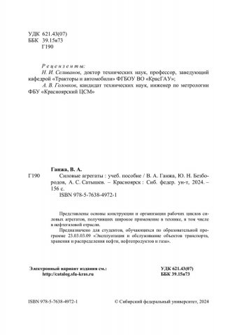 Библиографическое описание: Ганжа, Владимир Александрович. Силовые агрегаты : учебное пособие / В. А. Ганжа, Ю. Н. Безбородов, А. С. Сатышев ; рец.: Н. И. Селиванов, А. В. Головков ; Сибирский федеральный университет, Институт нефти и газа. - Электрон. текстовые дан. (10,0 Мб). - Красноярск : СФУ, 2024 (2024-10-25). - 156 с., 9.8 усл. печ. л. : цв. ил. - Загл. с титул. экрана. - Электрон. версия печ. публикации . - Библиогр.: с. 138-139. - 100 экз. - ISBN 978-5-7638-4972-1 : Б. ц. - Изд. № 2024-21475. - Текст : электронный.