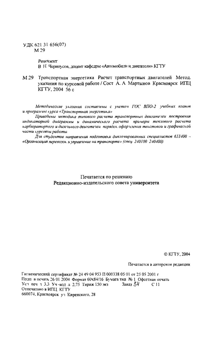Библиографическое описание:Мартынов, Анатолий Алексеевич. Транспортная энергетика. Расчет транспортных двигателей : метод. указ. по курсовой работе / А. А. Мартынов ; Краснояр. гос. техн. ун-т. - Красноярск : ИПЦ КГТУ, 2004. - 56 с. : табл. - Библиогр.: с. 56. - 10.00 р. - Текст : непосредственный + Текст : электронный.
