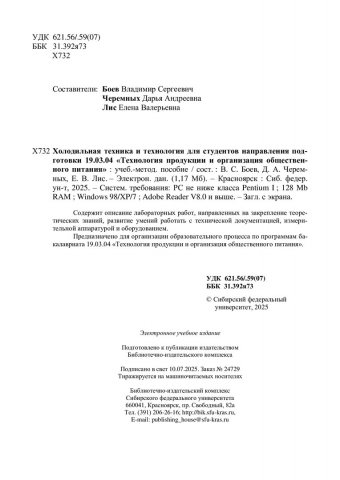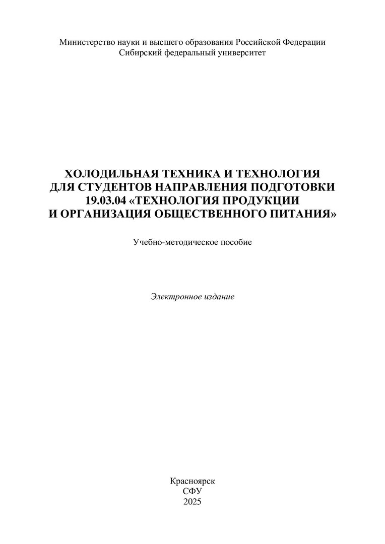 Библиографическое описание:Холодильная техника и технология для студентов направления подготовки 19.03.04 "Технология продукции и организация общественного питания" : учебно-методическое пособие / Сибирский федеральный университет, Институт торговли и сферы услуг ; сост.: В. С. Боев, Д. А. Черемных, Е. В. Лис. - Электрон. текстовые дан. (pdf, 1,2 Мб). - Красноярск : СФУ, 2025 (2025-07-10). - 53 с. - Загл. с титул. экрана. - Библиогр.: с. 51-53. - Изд. № 2025-24729 : Б. ц. - Текст : электронный.