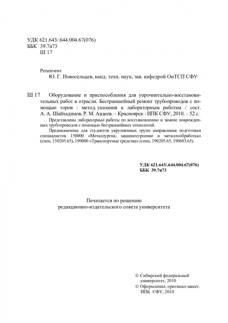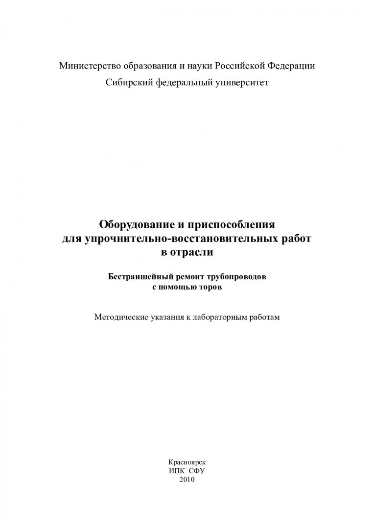 Библиографическое описание:Шайхадинов, Александр Анатольевич. Оборудование и приспособления для упрочнительно-восстановительных работ в отрасли. Бестраншейный ремонт трубопроводов с помощью торов : метод. указ. к лаб. работам / А. А. Шайхадинов, Р. М. Авдеев ; Сиб. федерал. ун-т. - Красноярск : ИПК СФУ, 2010. - 49 с. : ил. - Библиогр.: с. 47-48. - 100 экз. - Текст : непосредственный + Текст : электронный.