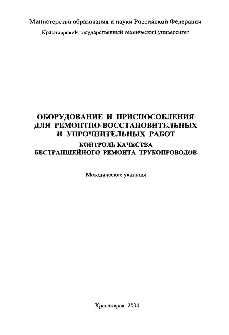 Оборудование и приспособления для ремонтно-восстановительных и упрочнительных работ. Контроль качества бестраншейного ремонта трубопроводов : метод. указ. по лаб. работам для студентов направлений подгот. дипломир. спец. 651400, 653200, 653300