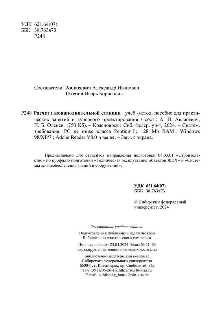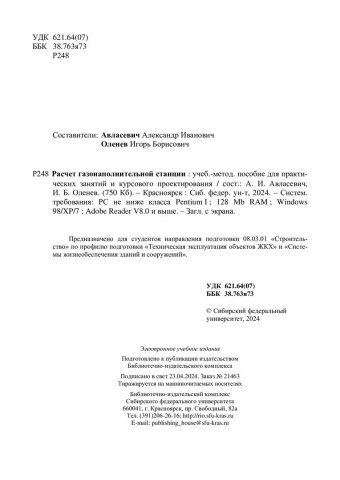 Библиографическое описание:Расчет газонаполнительной станции : учебно-методическое пособие для практических занятий и курсового проектирования / Сиб. федер. ун-т, Инж.-строит. ин-т ; сост.: А. И. Авласевич, И. Б. Оленев. - Электрон. текстовые дан. (pdf, 0,9 Мб). - Красноярск : СФУ, 2024 (2024-04-23). - 18 с. - Загл. с титул. экрана. - Изд. № 2024-21463 : Б. ц. - Текст : электронный.
