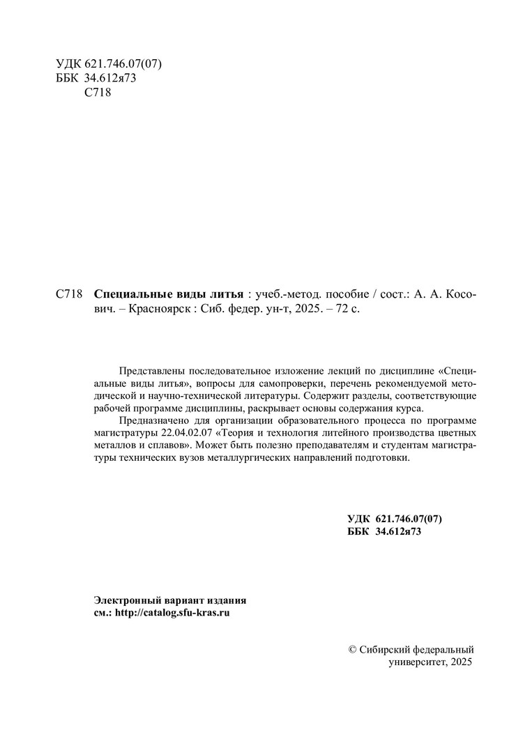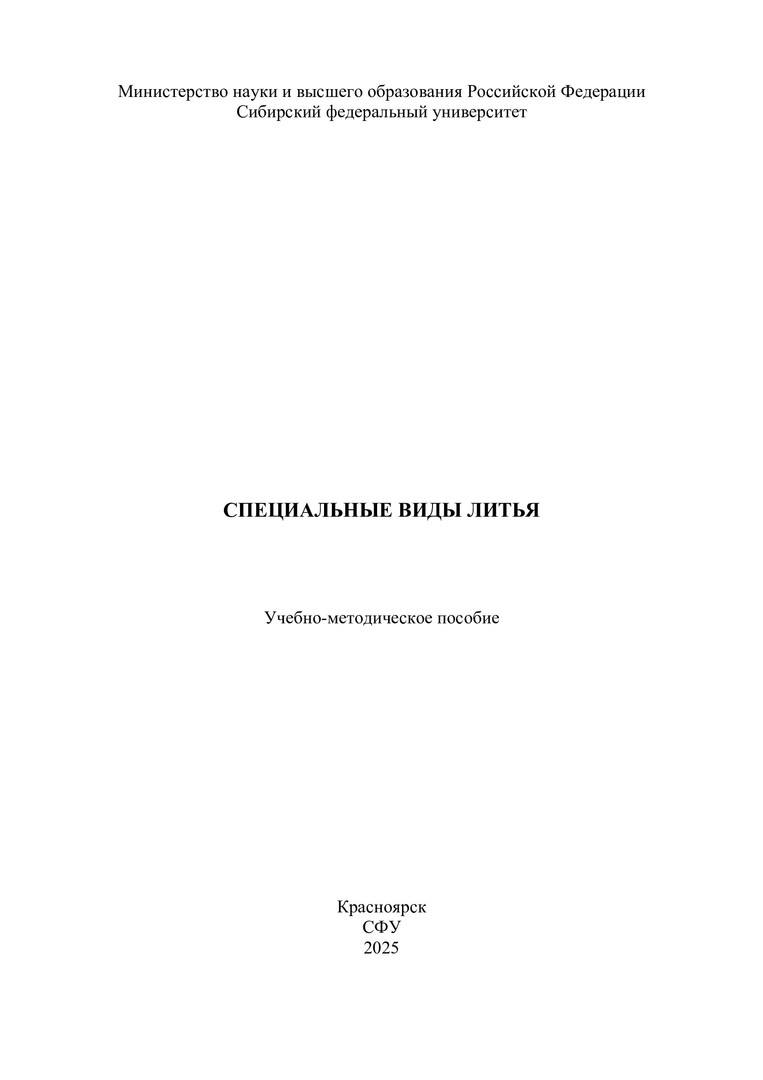 Библиографическое описание: Специальные виды литья : учебно-методическое пособие / Сибирский федеральный университет ; сост. А. А. Косович. - Электрон. текстовые дан. (pdf, 2.3 Мб). - Красноярск : СФУ, 2025 (2025-09-30). - 72 с. - Загл. с титул. экрана. - Электрон. версия печ. публикации . - Библиогр.: с. 69-71. - 100 экз. - Изд. № 2025-25129 : Б. ц. - Текст : электронный.