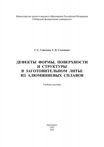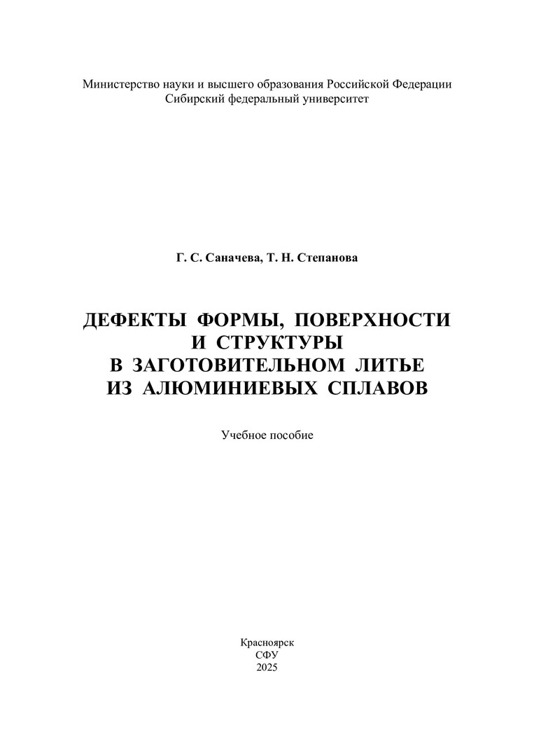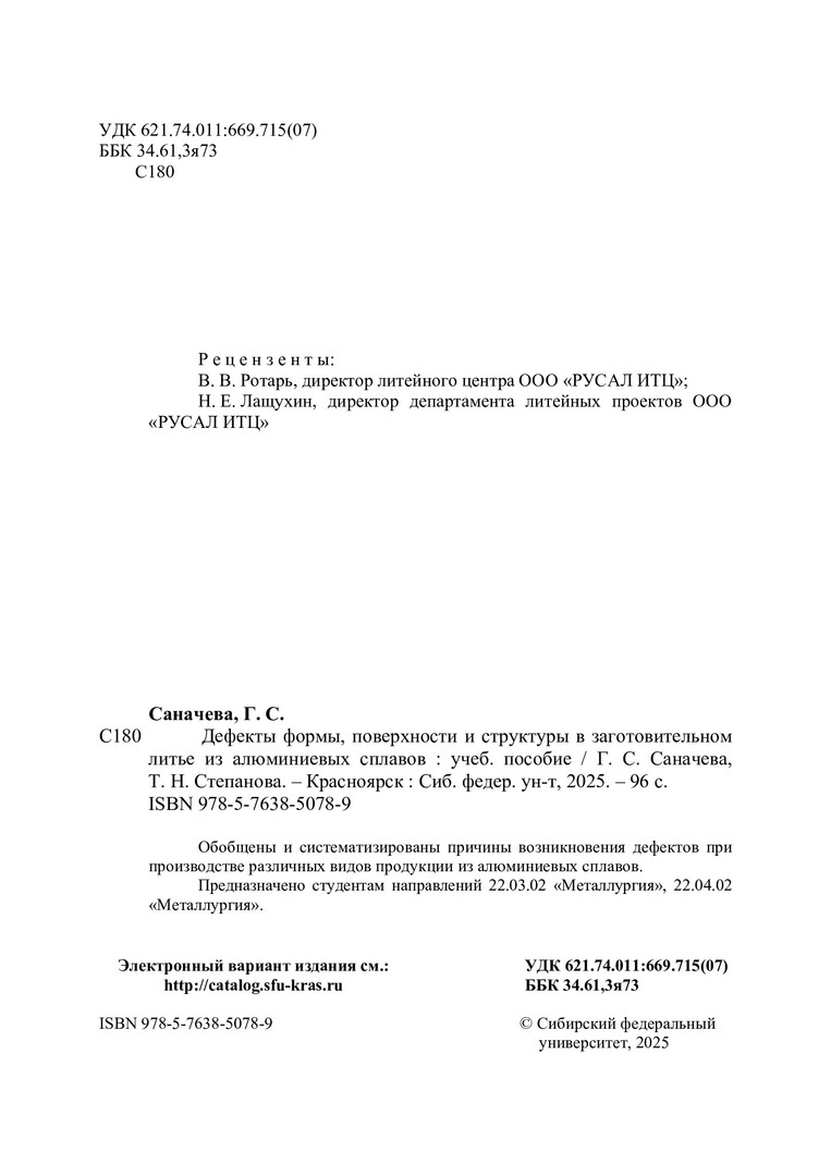 Библиографическое описание: Саначева, Галина Сергеевна. Дефекты формы, поверхности и структуры в заготовительном литье из алюминиевых сплавов : учебное пособие / Г. С. Саначева, Т. Н. Степанова ; рец.: В. В. Ротарь, Н. Е. Лащухин ; Сибирский федеральный университет, Институт цветных металлов. - Электрон. текстовые дан. (pdf ; 34,5 Мб). - Красноярск : СФУ, 2025 (2025-05-21). - 96 с., 6.0 усл. печ. л. : ил. - Загл. с титул. экрана. - Электрон. версия печ. публикации . - Библиогр.: с. 94. - 100 экз. - ISBN 978-5-7638-5078-9 : Б. ц. - Изд. № 2024-23535. - Текст : электронный.
