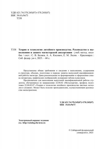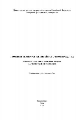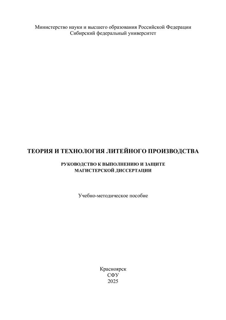 Библиографическое описание: Теория и технология литейного производства. Руководство к выполнению и защите магистерской диссертации : учебно-методическое пособие / Сибирский федеральный университет, Институт цветных металлов ; сост.: С. В. Беляев, А. А. Косович, Е. М. Лесив. - Электрон. текстовые дан. (pdf, 2.8 Мб). - Красноярск : СФУ, 2025 (2025-09-19). - 60 с. - Загл. с титул. экрана. - Электрон. версия печ. публикации . - Библиогр.: с. 48-51. - 100 экз. - Изд. № 2025-25127 : Б. ц. - Текст : электронный.