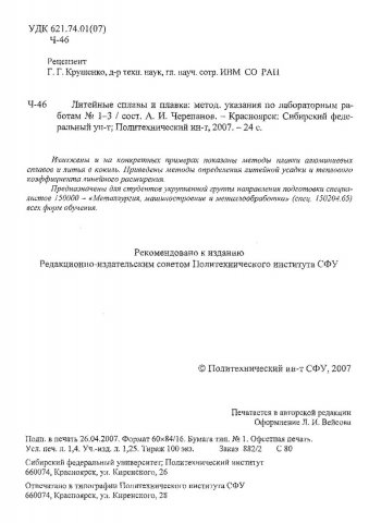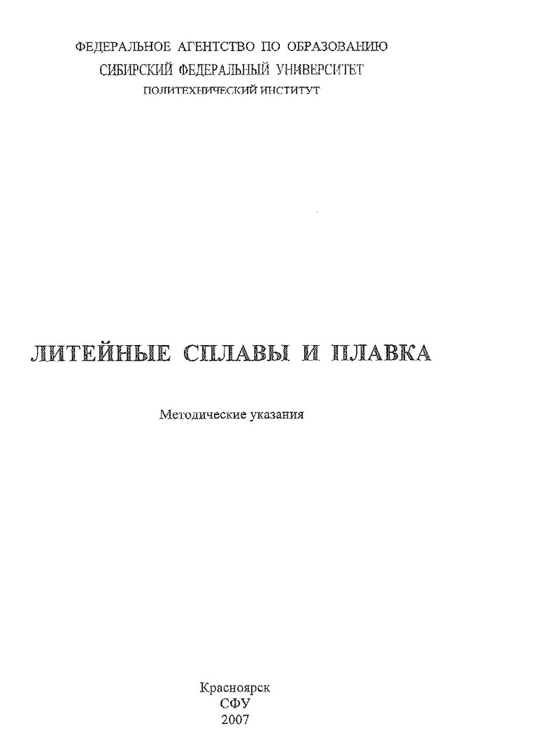 Библиографическое описание:Литейные сплавы и плавка : метод. указ. по лаб. работам № 1-3 / Сиб. федер. ун-т, Политехн. ин-т ; сост. А. И. Черепанов. - Красноярск : ИПК СФУ, 2007. - 24 с. - Загл. с титул. экрана. - Библиогр.: с. 23. - 100 экз. - Текст : непосредственный + Текст : электронный.