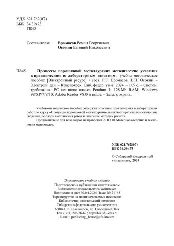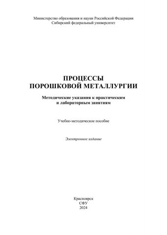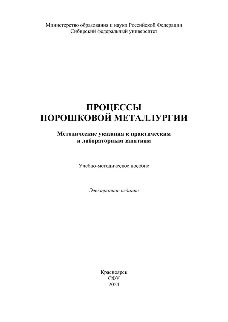 Библиографическое описание: Процессы порошковой металлургии : учебно-методическое пособие / Сиб. федер. ун-т, Ин-т цветных металлов ; сост.: Р. Г. Еромасов, Е. Н. Осокин. - Электрон. текстовые дан. (pdf, 2,8 Мб). - Красноярск : СФУ, 2024. - 109 с. - Загл. с титул. экрана. - Изд. № 2024-21165 : Б. ц. - Текст : электронный.