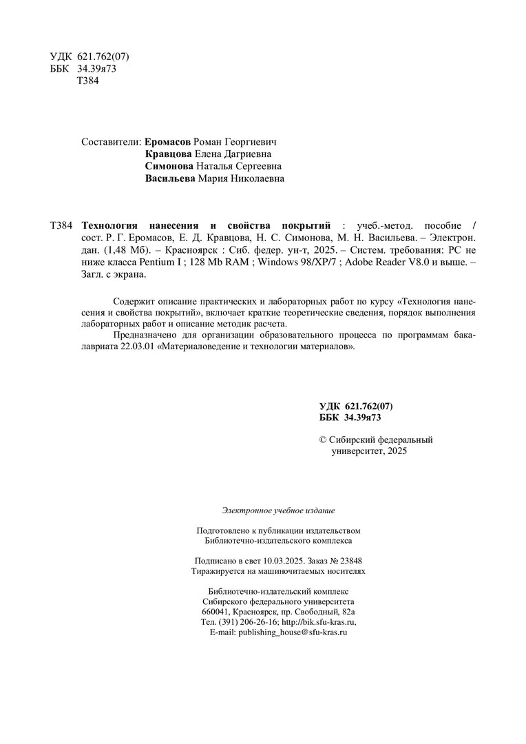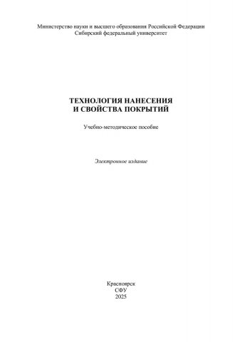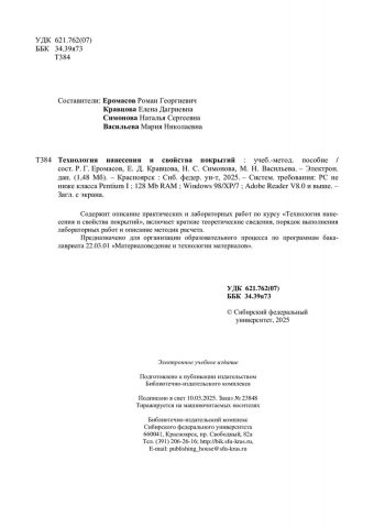 Библиографическое описание: Технология нанесения и свойства покрытий : учебно-методическое пособие / Сибирский федеральный университет, Институт цветных металлов ; сост.: Р. Г. Еромасов, Е. Д. Кравцова, Н. С. Симонова, М. Н. Васильева. - Электрон. текстовые дан. (pdf, 1,5 Мб). - Красноярск : СФУ, 2025 (2025-03-10). - 115 с. - Загл. с титул. экрана. - Библиогр.: с. 113-114. - Изд. № 2025-23848 : Б. ц. - Текст : электронный.