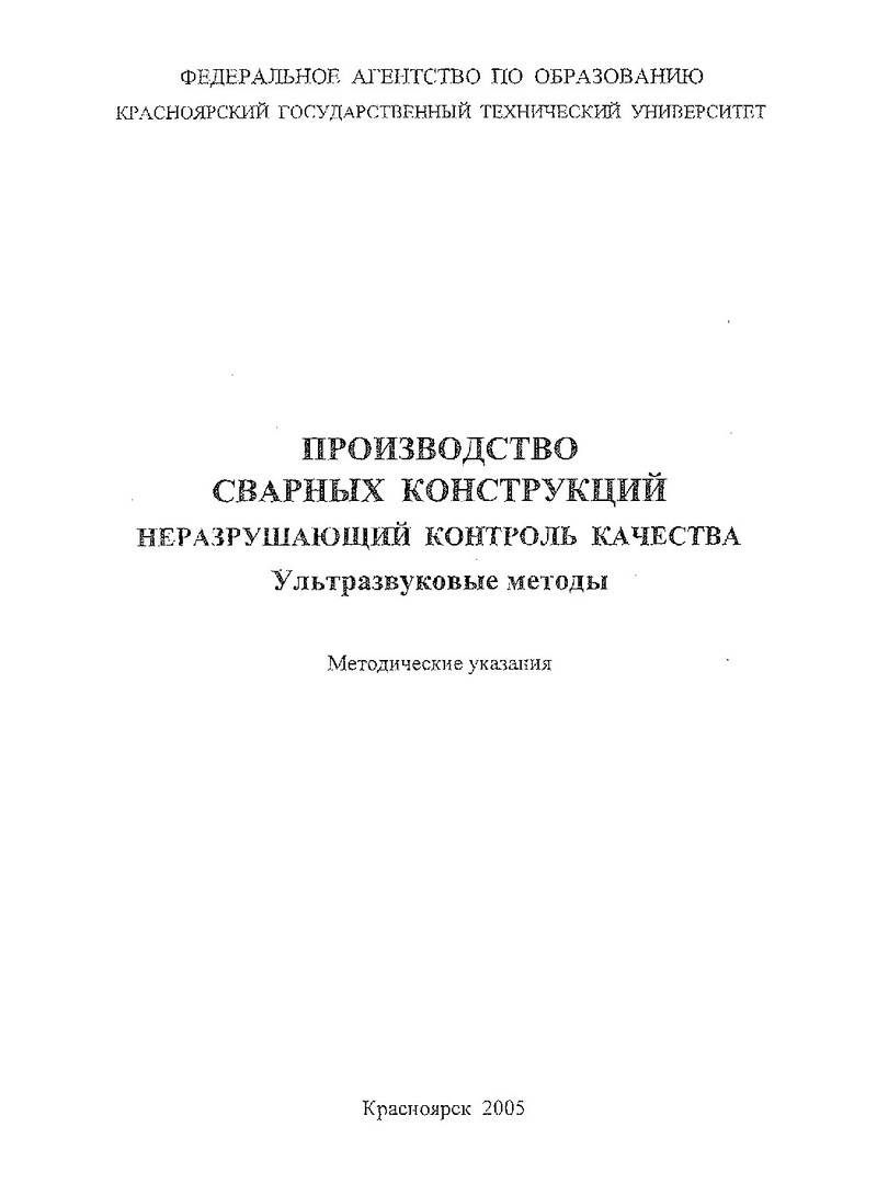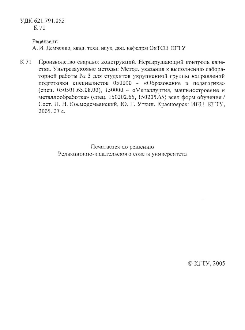 Библиографическое описание:Космодемьянский, Павел Николаевич. Производство сварных конструкций. Неразрушающий контроль качества. Ультразвуковые методы : метод. указ. к выполнению лаб. работы № 3 для студентов укрупненной группы направлений подгот. спец. 050000, 150000 всех форм обучения / П. Н. Космодемьянский, Ю. Г. Уткин ; Краснояр. гос. техн. ун-т. - Красноярск : ИПЦ КГТУ, 2005. - 27 с. : ил., табл. - (Учебно-методическая литература). - Загл. с титул. экрана. - Библиогр.: с. 25. - Текст : непосредственный + Текст : электронный.
