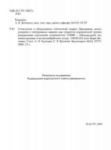 Библиографическое описание:Рукосуев, Анатолий Петрович. Технология и оборудование контактной сварки : Программа, метод. указ. и контрол. задания для студентов укрупненной группы направления подготовки спец. 150000 (спец. 150202.65) всех форм обучения / А. П. Рукосуев, С. Л. Бусыгин ; Краснояр. гос. техн. ун-т. - Красноярск : ИПЦ КГТУ, 2005. - 22 с. - Загл. с титул. экрана. - 100 экз. - Текст : непосредственный + Текст : электронный.