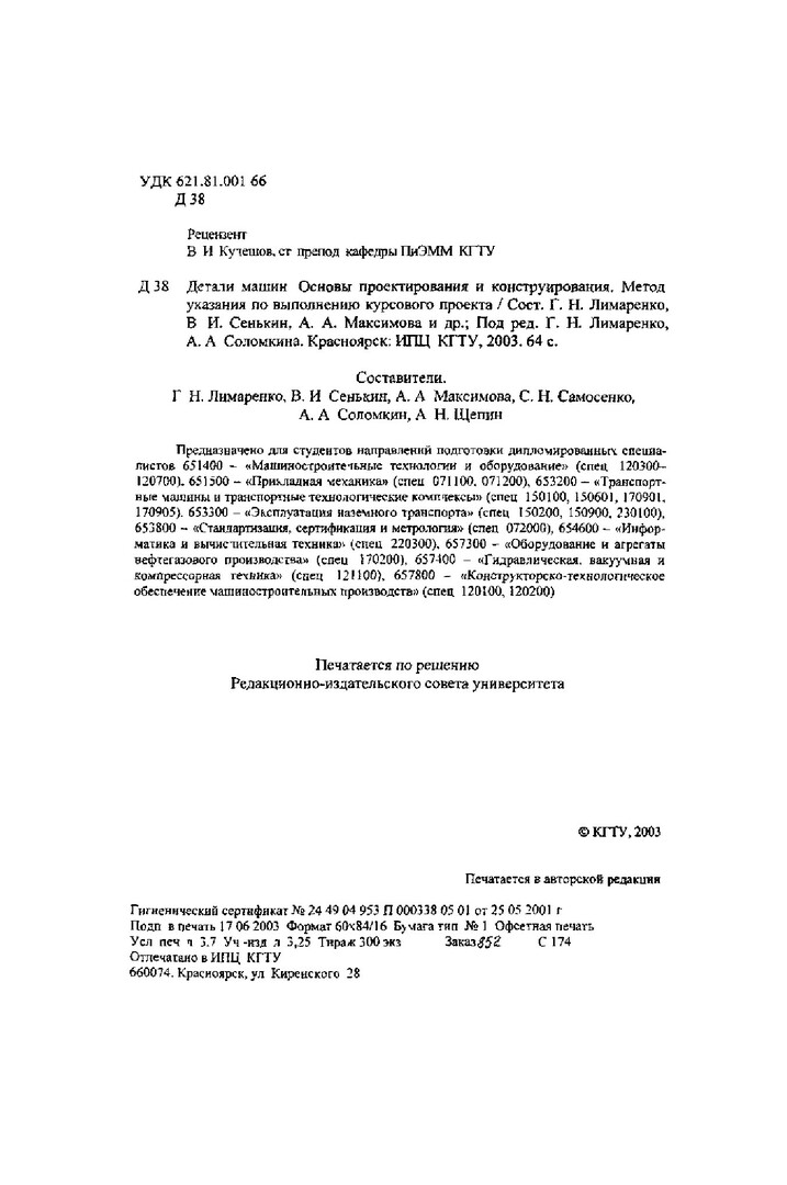 Библиографическое описание:Детали машин. Основы проектирования и конструирования : метод. указ. по выполнению курсового проекта / Г. Н. Лимаренко, В. И. Сенькин, А. А. Максимова ; ред. Г. Н. Лимаренко ; Краснояр. гос. техн. ун-т. - Электрон. текстовые дан.(3 Мб). - Красноярск : ИПЦ КГТУ, 2003. - 64 с. : ил. - Загл. с титул. экрана. - Электрон. версия печ. публикации . - Текст : непосредственный.