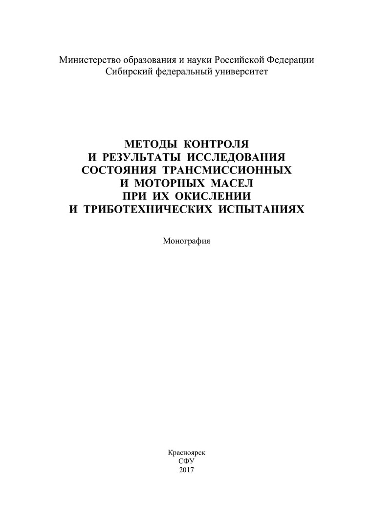 Библиографическое описание:Методы контроля и результаты исследования состояния трансмиссионных и моторных масел при их окислении и триботехнических испытаниях : монография / В. И. Верещагин [и др.]. ; Сиб. федер. ун-т, Ин-т нефти и газа. - Красноярск : СФУ, 2017. - 200 с. : ил., граф., табл. - Библиогр.: с. 184-200. - 500 экз. - ISBN 978-5-7638-3679-0 : 411.00 р. - Изд. № 2017-1505. - Текст : непосредственный + Текст : электронный.