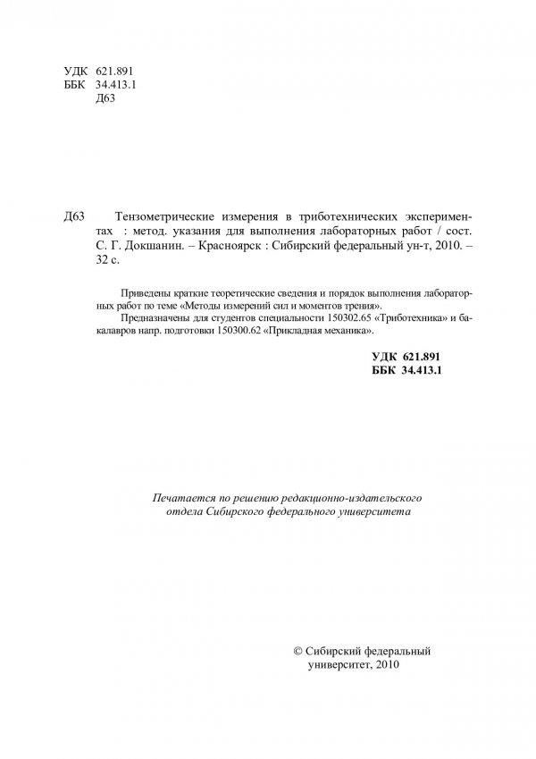 Библиографическое описание:Тензометрические измерения в триботехнических экспериментах : метод. указ. для выполнения лаб. работ / Сиб. федерал. ун-т ; сост. С. Г. Докшанин. - Красноярск : ИПК СФУ, 2010. - 30 с. : ил. - Библиогр.: с. 28-29. - 50 экз. - Текст : непосредственный + Текст : электронный.