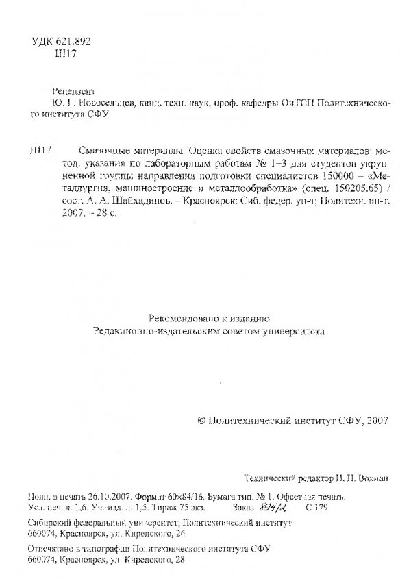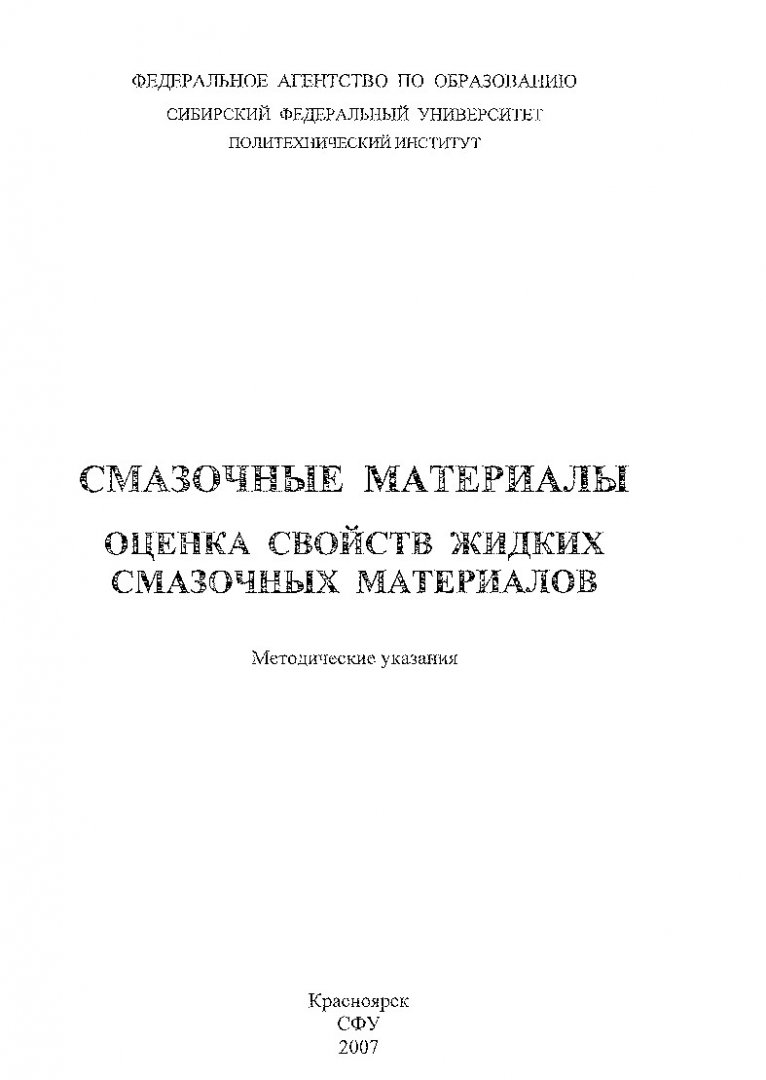 Библиографическое описание:Шайхадинов, Александр Анатольевич. Смазочные материалы. Оценка свойств жидких смазочных материалов : метод. указ. по лаб. работам № 1-3 для студентов укр. гр. подг. спец. 150000- "Металлургия, машиностроение и металлообработка" / А. А. Шайхадинов ; Сиб. федер. ун-т, Политехн. ин-т. - Красноярск : ИПК СФУ, 2007. - 28 с. - 75 экз. - Текст : непосредственный + Текст : электронный.