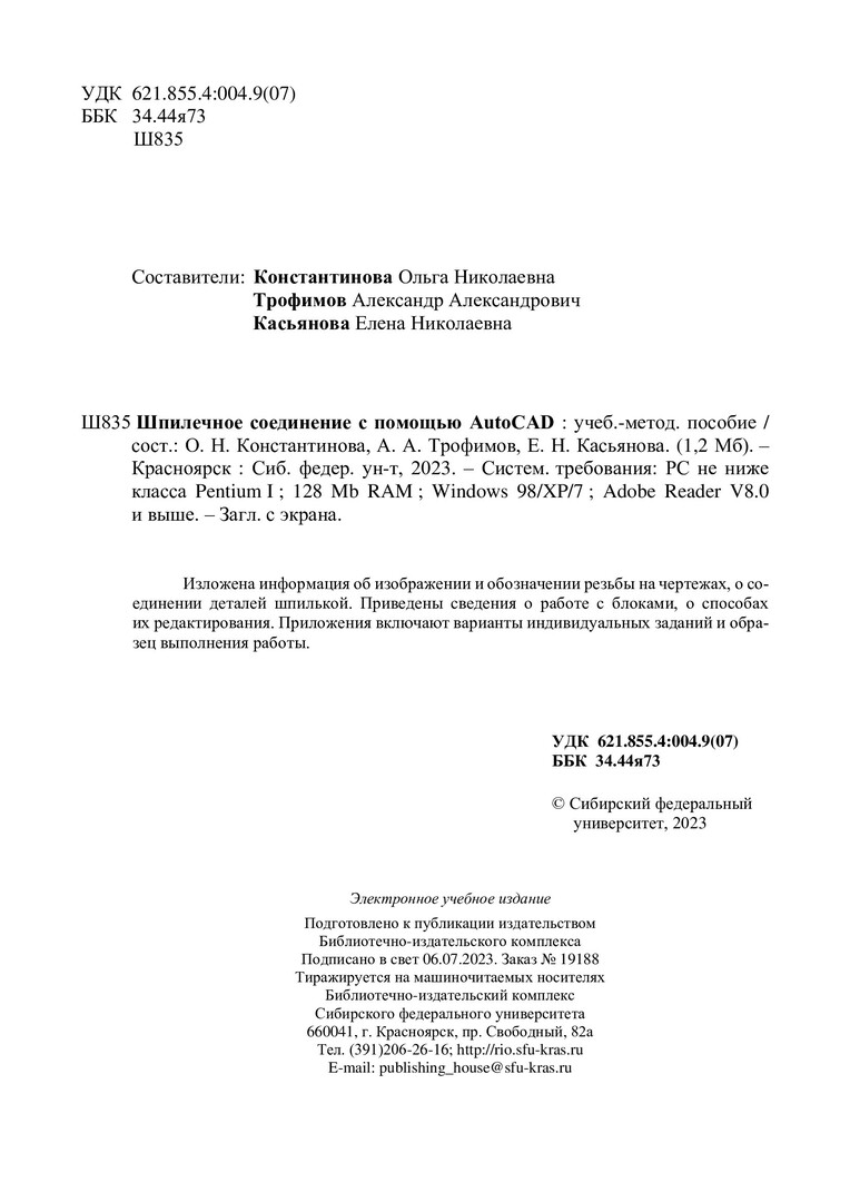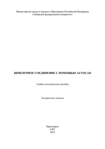Библиографическое описание:Шпилечное соединение с помощью AutoCAD : учебно-методическое пособие / Сиб. федер. ун-т, Ин-т цветных металлов ; сост.: О. Н. Константинова, А. А. Трофимов, Е. Н. Касьянова. - Электрон. текстовые дан. (pdf, 1,3 Мб). - Красноярск : СФУ, 2023 (2023-06-06). - 23 с. - Загл. с титул. экрана. - Изд. № 2023-19188 : Б. ц. - Текст : электронный.