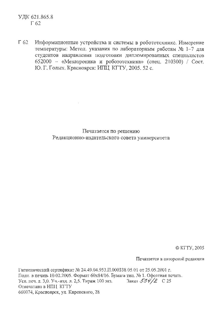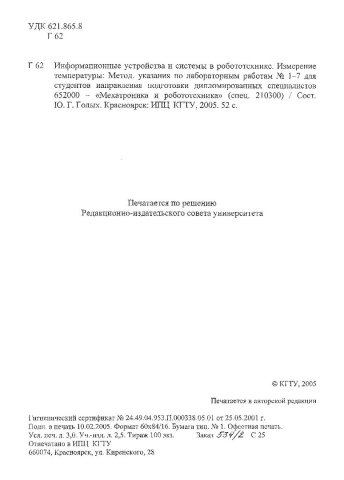 Библиографическое описание:Голых, Юрий Геннадьевич. Информационные устройства и системы в робототехнике. Измерение температуры : Метод. указ. по лаб. работам №1-7 для студентов напр. подг. дипломир. спец. 652000 / Ю. Г. Голых ; Краснояр. гос. техн. ун-т. - Красноярск : ИПЦ КГТУ, 2005. - 52 с. + Электрон. текст. дан.(4,59Мб). - (Учеб.-метод. лит.). - Загл. с титул. экрана. - Текст : непосредственный + Текст : электронный.