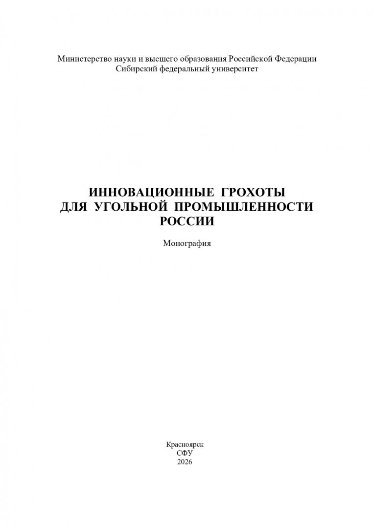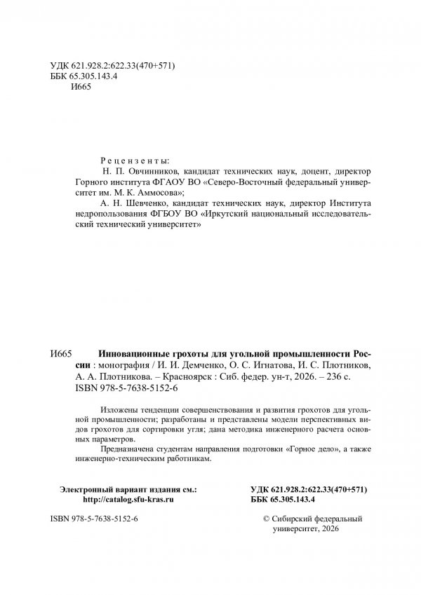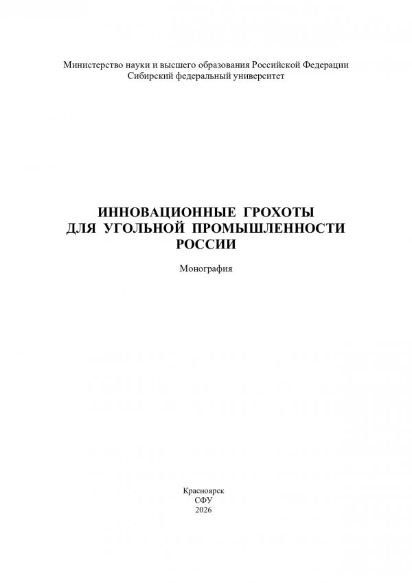 Библиографическое описание:Инновационные грохоты для угольной промышленности России : монография / И. И. Демченко, О. С. Игнатова, И. С. Плотников, А. А. Плотникова ; Сиб. федер. ун-т, Ин-т цветных металлов. - Электрон. текстовые дан. (pdf, 19.4 Мб). - Красноярск : СФУ, 2026 (2026-02-02). - 236 с., 14.8 усл. печ. л. - Загл. с титул. экрана. - Электрон. версия печ. публикации . - 500 экз. - ISBN 978-5-7638-5152-6 : Б. ц. - Изд. № 2025-25036. - Текст : непосредственный + Текст : электронный.