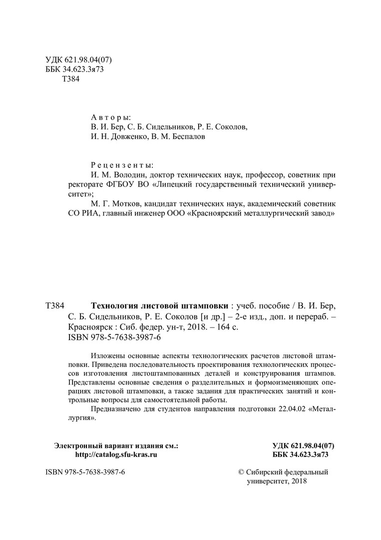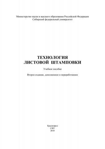 Библиографическое описание: Технология листовой штамповки : учебное пособие / В. И. Бер [и др.]. ; Сиб. федер. ун-т, Ин-т цвет. металлов и материаловедения. - 2-е изд., доп. и перераб. - Красноярск : СФУ, 2018. - 161 с. : ил., табл. - Библиогр.: с. 155-156. - 100 экз. - ISBN 978-5-7638-3987-6 : 254.00 р. - Изд. № 2018-6103. - Текст : непосредственный + Текст : электронный.