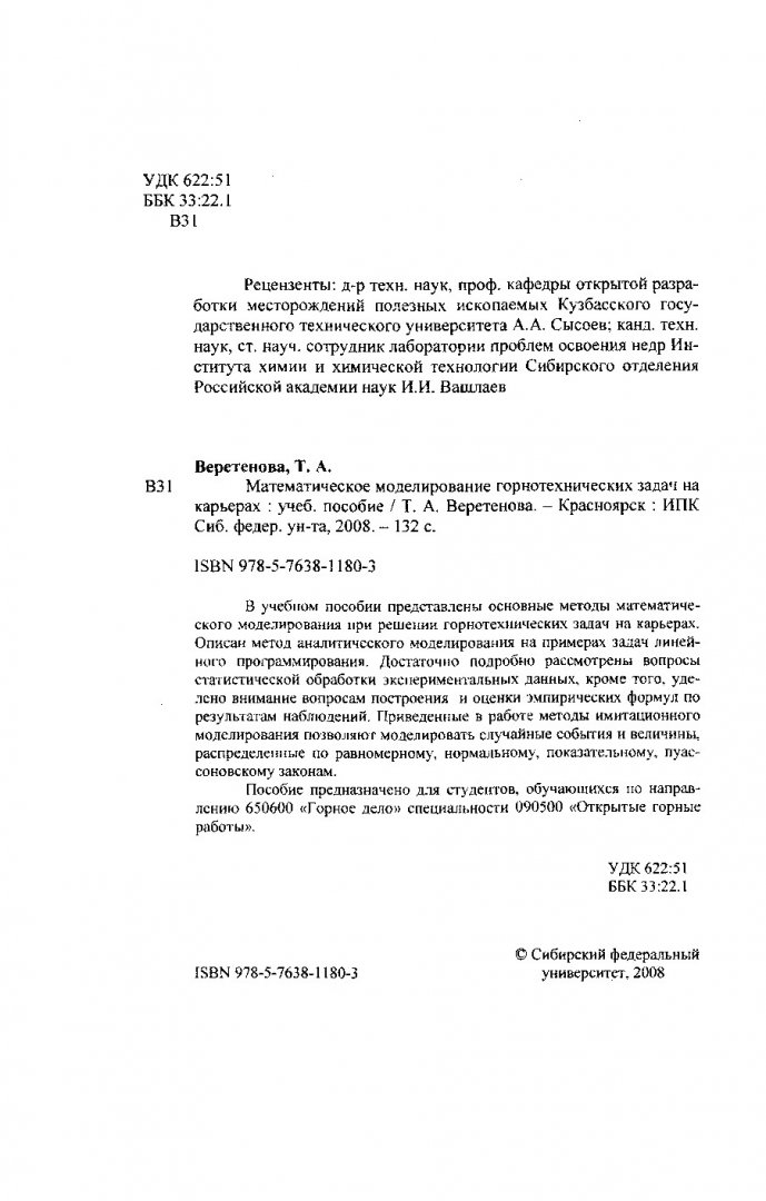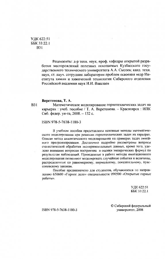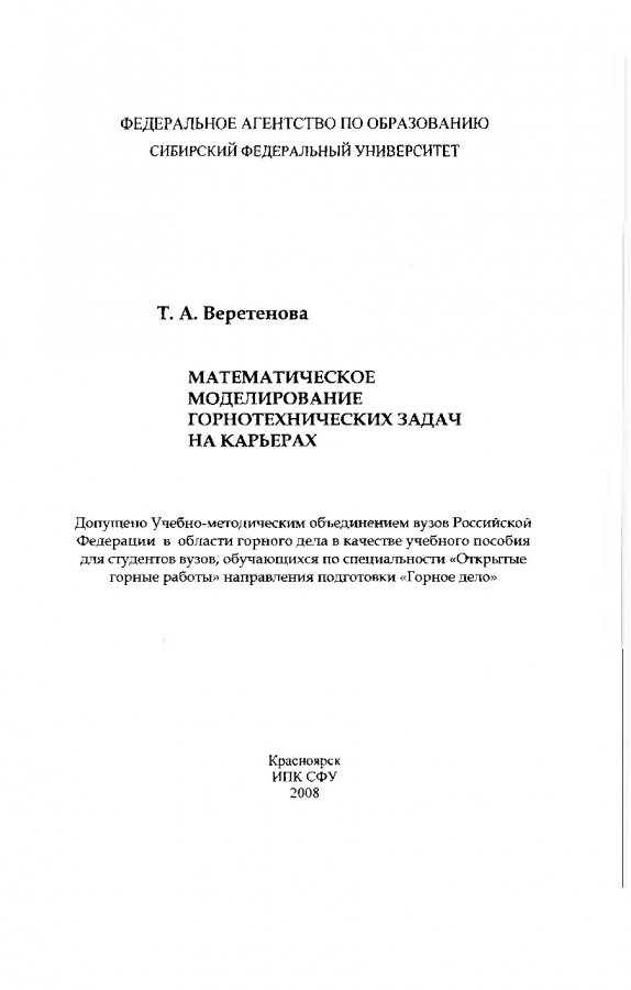 Библиографическое описание: Веретенова, Татьяна Анатольевна. Математическое моделирование горнотехнических задач на карьерах : учеб. пособие для вузов по спец. "Открытые горные работы" направления подготовки "Горное дело" / Т. А. Веретенова. - Красноярск : ИПК СФУ, 2008. - 130 с. : ил., табл. - Список лит.: с.119-120; Предмет. ук.: с.127-128. - ISBN 978-5-7638-1180-3 : б/ц, 100.00 р. - Текст : непосредственный + Текст : электронный.