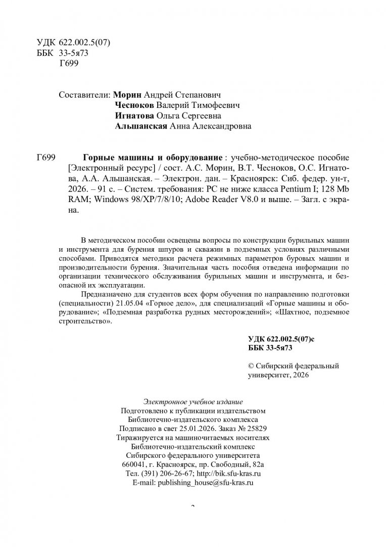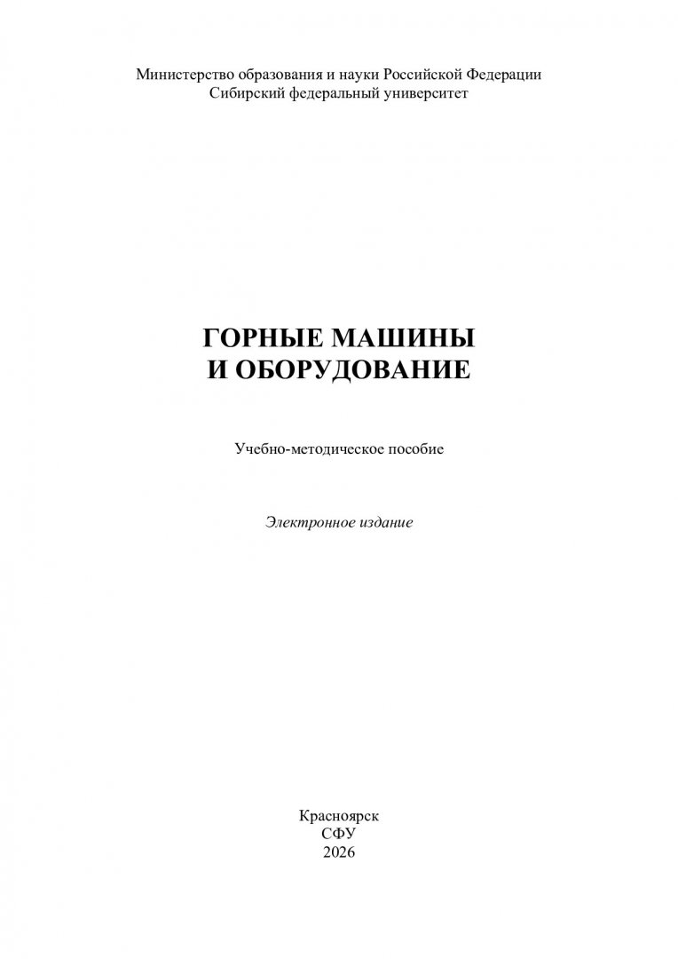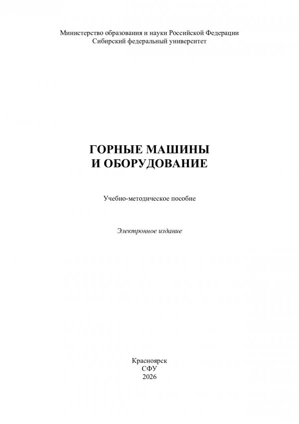 Библиографическое описание: Горные машины и оборудование : [практические работы] : учебно-методическое пособие / Сибирский федеральный университет, Институт цветных металлов ; сост.: А. С. Морин, В. Т. Чесноков, О. С. Игнатова, А. А. Альшанская. - Электрон. текстовые дан. (pdf, 2.5 Мб). - Красноярск : СФУ, 2026 (2026-01-25). - 91 с. : ил., табл. - Загл. с титул. экрана. - Библиогр.: с. 91. - Изд. № 2025-25829 : Б. ц. - Текст : электронный.