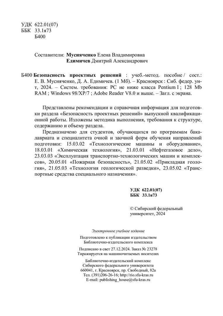 Библиографическое описание: Безопасность проектных решений : учебно-методическое пособие / Сибирский федеральный университет, Институт нефти и газа ; сост.: Е. В. Мусияченко, Д. А. Едимичев. - Электрон. текстовые дан. (pdf, 0,9 Мб). - Красноярск : СФУ, 2024 (2024-12-27). - 69 с. - Загл. с титул. экрана. - Библиогр.: с. 16-21. - Изд. № 2024-23278 : Б. ц. - Текст : электронный.