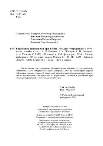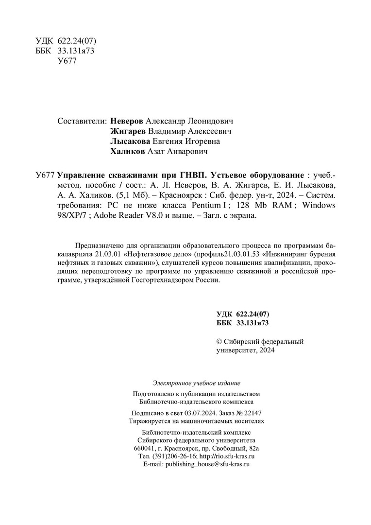Библиографическое описание:Управление скважинами при ГНВП. Устьевое оборудование : учебно-методическое пособие / Сиб. федер. ун-т, Ин-т нефти и газа ; сост. А. Л. Неверов [и др.]. - Электрон. текстовые дан. (pdf, 5,1 Мб). - Красноярск : СФУ, 2024 (2024-07-03). - 178 с. - Загл. с титул. экрана. - Изд. № 2024-22147 : Б. ц. - Текст : электронный.