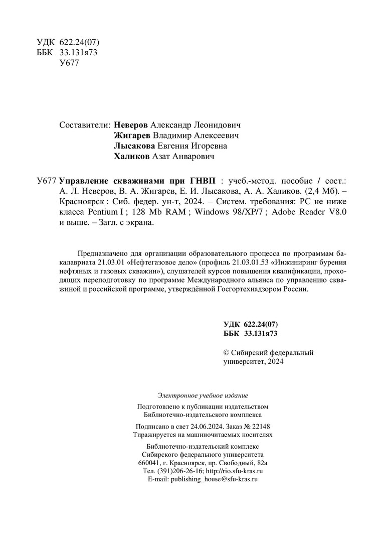 Библиографическое описание: Управление скважинами при ГНВП : учебно-методическое пособие / Сиб. федер. ун-т, Ин-т нефти и газа ; сост. А. Л. Неверов [и др.]. - Электрон. текстовые дан. (pdf, 2,5 Мб). - Красноярск : СФУ, 2024 (2024-06-24). - 175 с. - Загл. с титул. экрана. - Изд. № 2024-22148 : Б. ц. - Текст : электронный.
