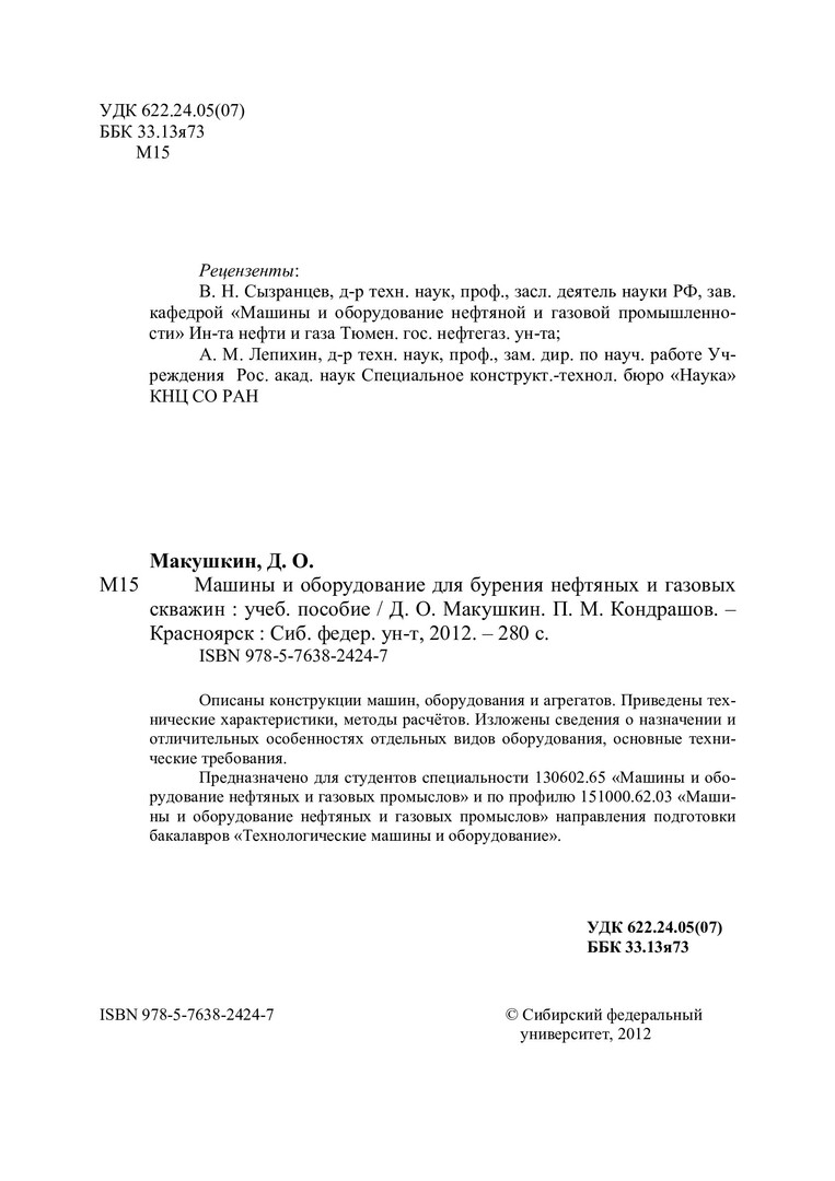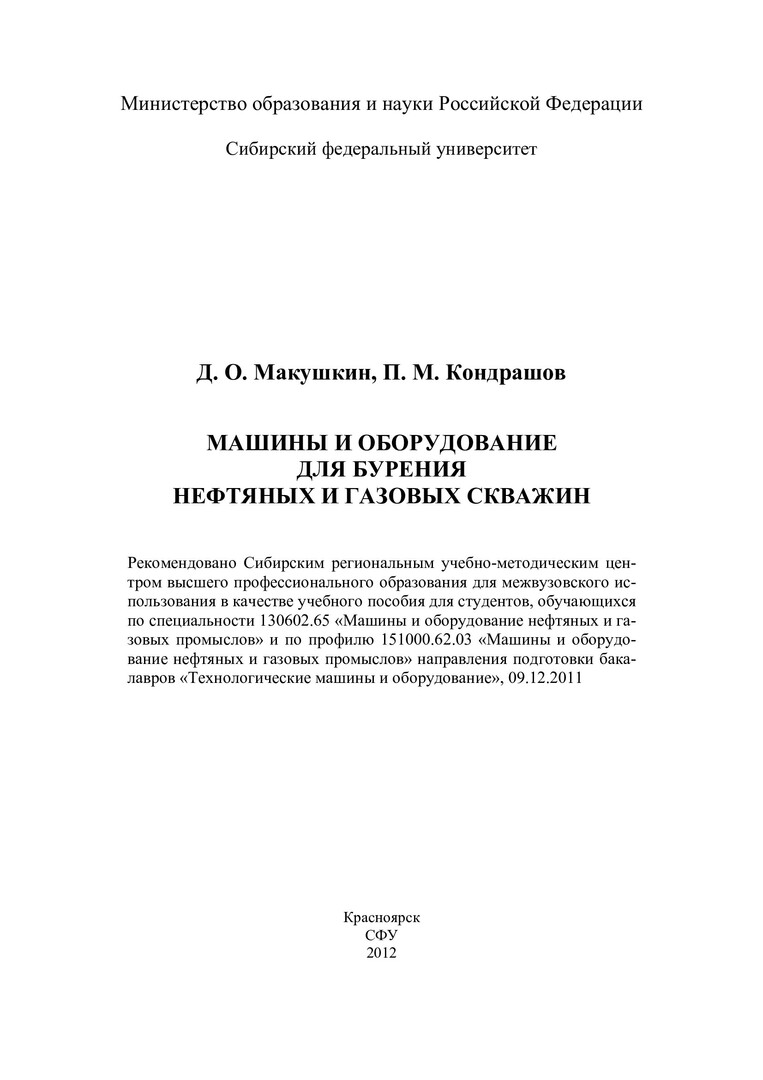 Библиографическое описание:Макушкин, Дамба Очирович. Машины и оборудование для бурения нефтяных и газовых скважин : учебное пособие для студентов вузов по специальности 130602.65 "Машины и оборудование нефтяных и газовых промыслов" и по профилю 151000.62.03 / Д. О. Макушкин, П. М. Кондрашов ; Сиб. федер. ун-т, Ин-т нефти и газа. - Красноярск : СФУ, 2012. - 277 с. : ил. - Библиогр.: с. 249-252. - 100 экз. - ISBN 978-5-7638-2424-7. - Изд. № 2012-4995. - Текст : непосредственный + Текст : электронный.