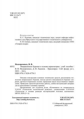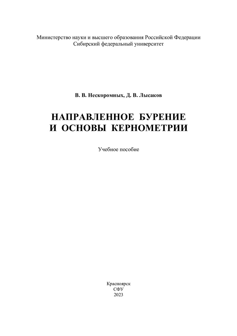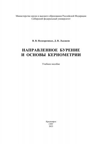 Библиографическое описание: Нескоромных, Вячеслав Васильевич. Направленное бурение и основы кернометрии : учебное пособие / В. В. Нескоромных, Д. В. Лысаков ; рец.: П. С. Пушмин, П. Ф. Еловых ; Сибирский федеральный университет, Институт цветных металлов. - Электрон. текстовые дан.(6,5 Мб). - Красноярск : СФУ, 2023 (2023-10-06). - 164 с., 10.3 усл. печ. л. : ил., граф., цв. ил., табл. - Загл. с титул. экрана. - Электрон. версия печ. публикации . - Библиогр.: с. 154. - 100 экз. - ISBN 978-5-7638-4770-3 : Б. ц. - Изд. № 2022-17622. - Текст : электронный.
