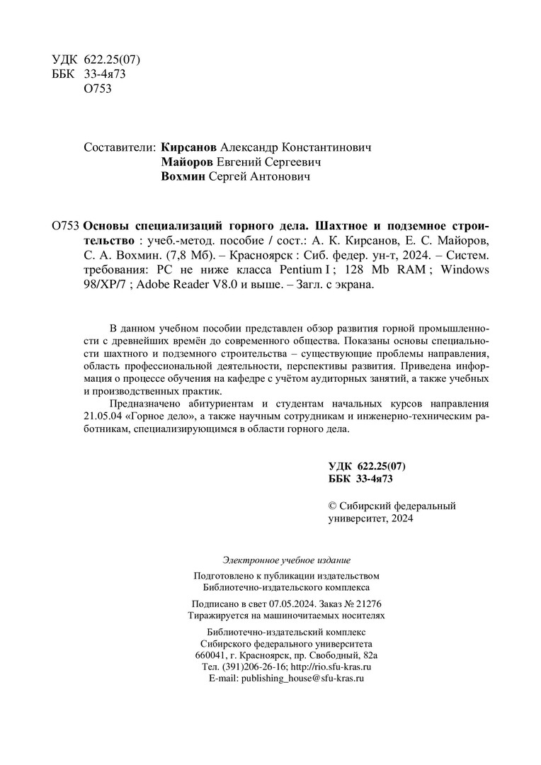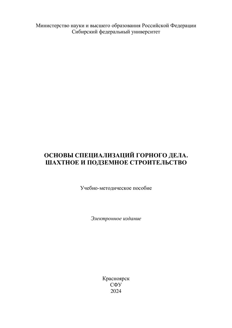 Библиографическое описание: Основы специализаций горного дела. Шахтное и подземное строительство : учебно-методическое пособие / Сибирский федеральный университет, Институт цветных металлов ; сост.: А. К. Кирсанов, Е. С. Майоров, С. А. Вохмин. - Электрон. текстовые дан. (pdf, 7,8 Мб). - Красноярск : СФУ, 2024 (2024-05-07). - 66 с. - Загл. с титул. экрана. - Изд. № 2024-21276 : Б. ц. - Текст : электронный.