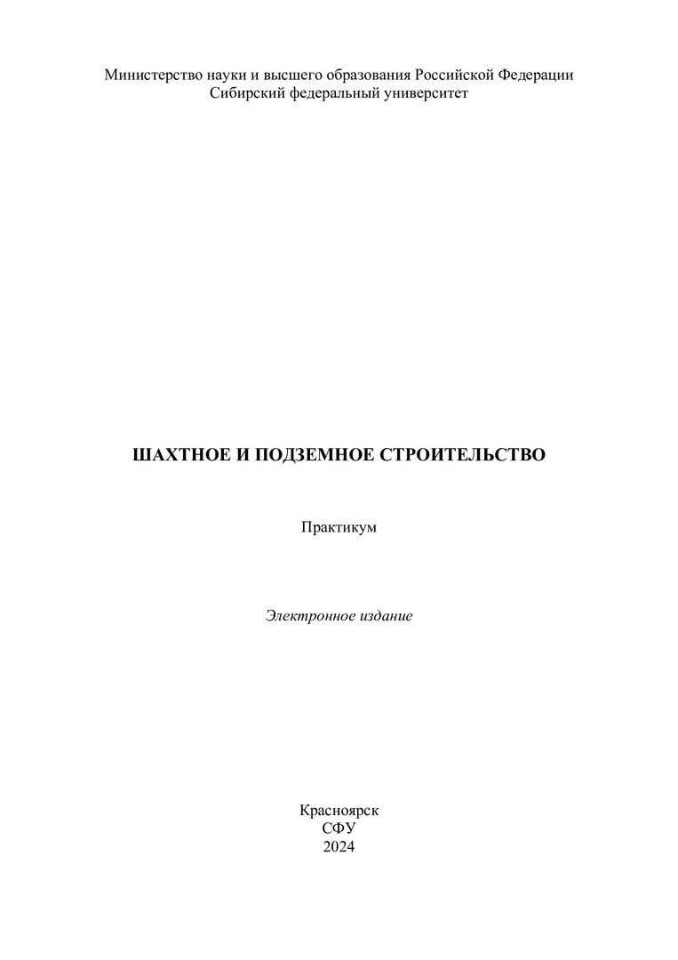 Библиографическое описание: Шахтное и подземное строительство : практикум / Сиб. федер. ун-т, Ин-т цветных металлов ; сост.: Ю. П. Требуш, С. А. Вохмин, А. К. Кирсанов. - Электрон. текстовые дан. (pdf, 10,4 Мб). - Красноярск : СФУ, 2024 (2024-11-08). - 106 с. - Загл. с титул. экрана. - Изд. № 2024-22951 : Б. ц. - Текст : электронный.