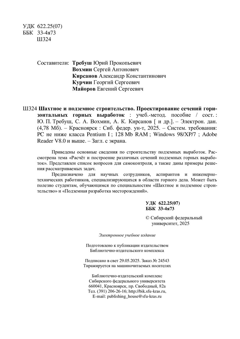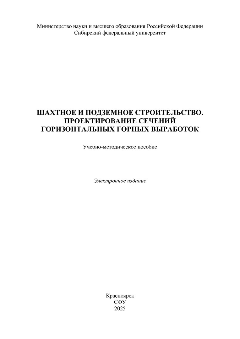 Библиографическое описание: Шахтное и подземное строительство. Проектирование сечений горизонтальных горных выработок : учебно-методическое пособие / Сиб. федер. ун-т, Ин-т цветных металлов ; сост. Ю. П. Требуш [и др.]. - Электрон. текстовые дан. (pdf, 4,9 Мб). - Красноярск : СФУ, 2025 (2025-05-29). - 149 с. - Загл. с титул. экрана. - Изд. № 2025-24543 : Б. ц. - Текст : электронный.