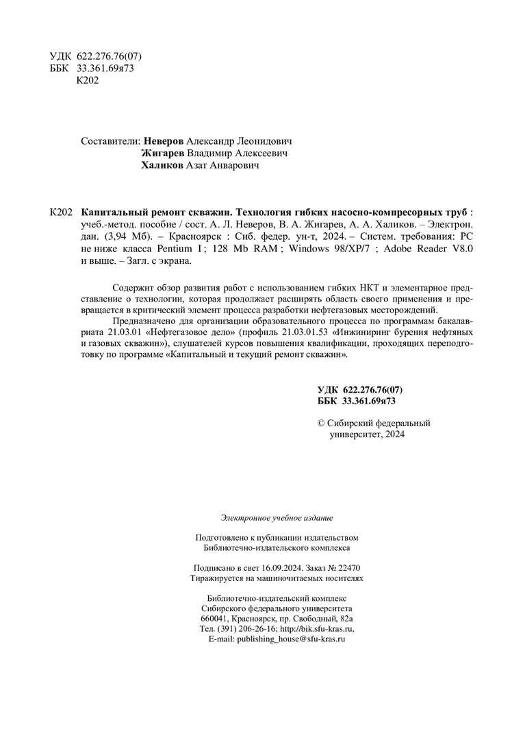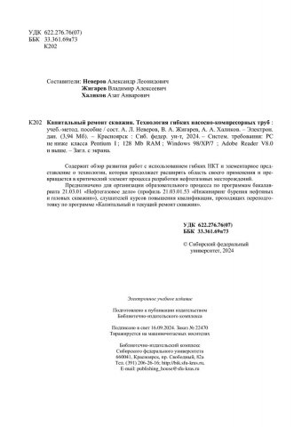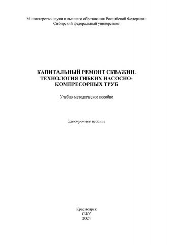Библиографическое описание: Капитальный ремонт скважин. Технология гибких насосно-компрессорных труб : учебно-методическое пособие / Сибирский федеральный университет, Институт нефти и газа ; сост.: А. Л. Неверов, В. А. Жигарев, А. А. Халиков. - Электрон. текстовые дан. (4,1 Мб). - Красноярск : СФУ, 2024 (2024-09-16). - 147 с. : цв. ил. - Загл. с титул. экрана. - Библиогр.: с. 146-147. - Изд. № 2024-22470 : Б. ц. - Текст : электронный.