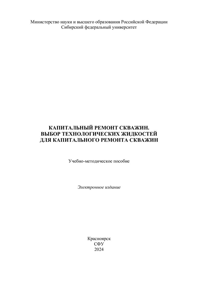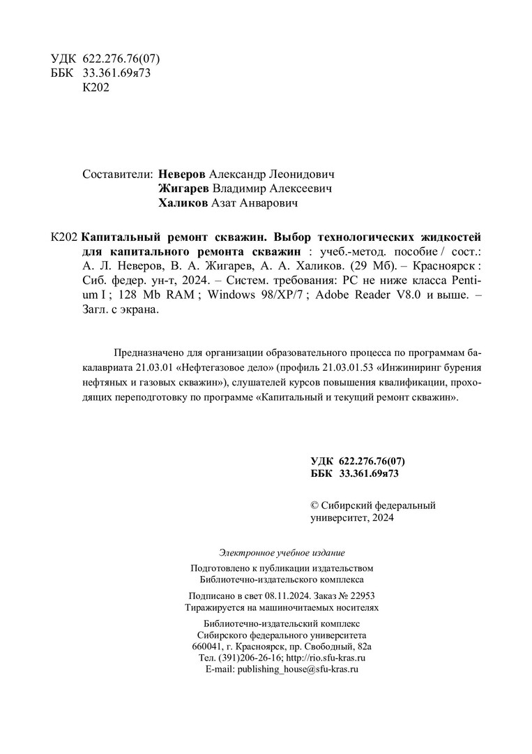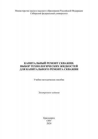 Библиографическое описание:Капитальный ремонт скважин. Выбор технологических жидкостей для капитального ремонта скважин : учебно-методическое пособие / Сибирский федеральный университет, Институт нефти и газа ; сост.: А. Л. Неверов, В. А. Жигарев, А. А. Халиков. - Электрон. текстовые дан. (pdf, 27,9 Мб). - Красноярск : СФУ, 2024 (2024-11-08). - 140 с. - Загл. с титул. экрана. - Изд. № 2024-22953 : Б. ц. - Текст : электронный.