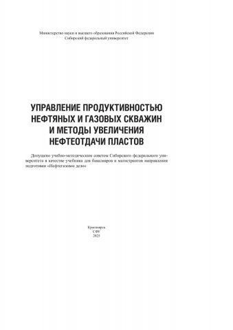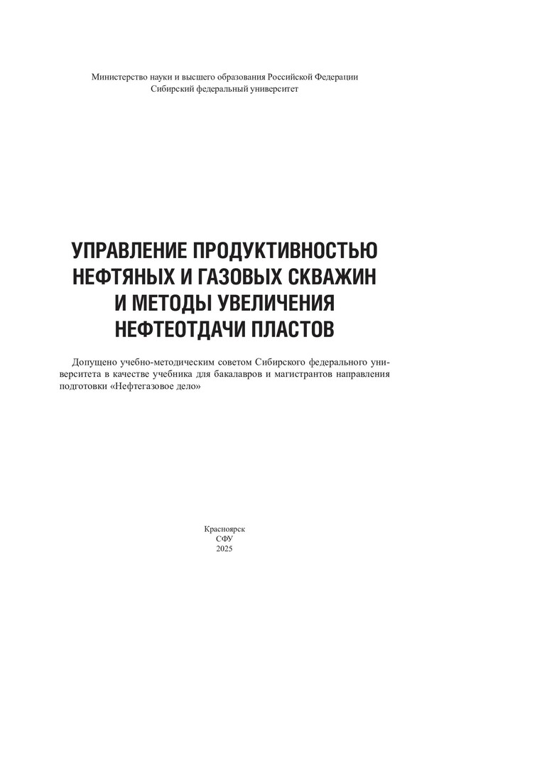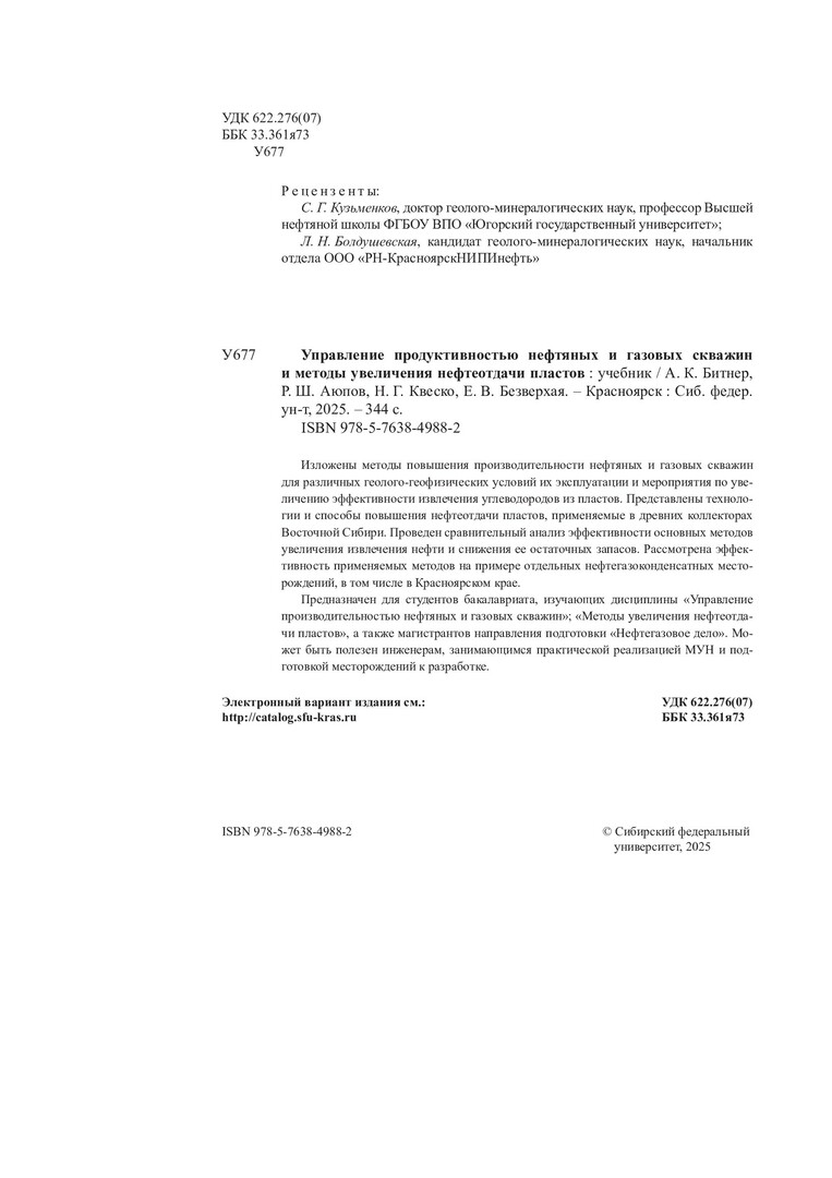 Библиографическое описание: Управление продуктивностью нефтяных и газовых скважин и методы управления нефтеотдачи пластов : учебник для бакалавров и магистрантов направления подготовки "Нефтегазового дела" / А. К. Битнер, Р. Ш. Аюпов, Н. Г. Квеско, Е. В. Безверхая ; рец.: С. Г. Кузьменков, Л. Н. Балдушевская ; Сибирский федеральный университет, Институт нефти и газа. - Электрон. текстовые дан. (24,6 Мб). - Красноярск : СФУ, 2025 (2025-03-10). - 344 с., 28.0 усл. печ. л. : ил., цв. ил., граф., табл. - (Учебник Сибирского федерального университета). - Загл. с титул. экрана. - Электрон. версия печ. публикации . - Библиогр.: с. 326-334. - 500 экз. - ISBN 978-5-7638-4988-2 : Б. ц. - Изд. № 2024-21912. - Текст : электронный.