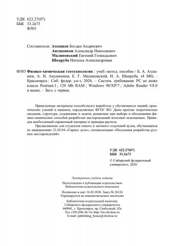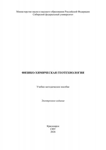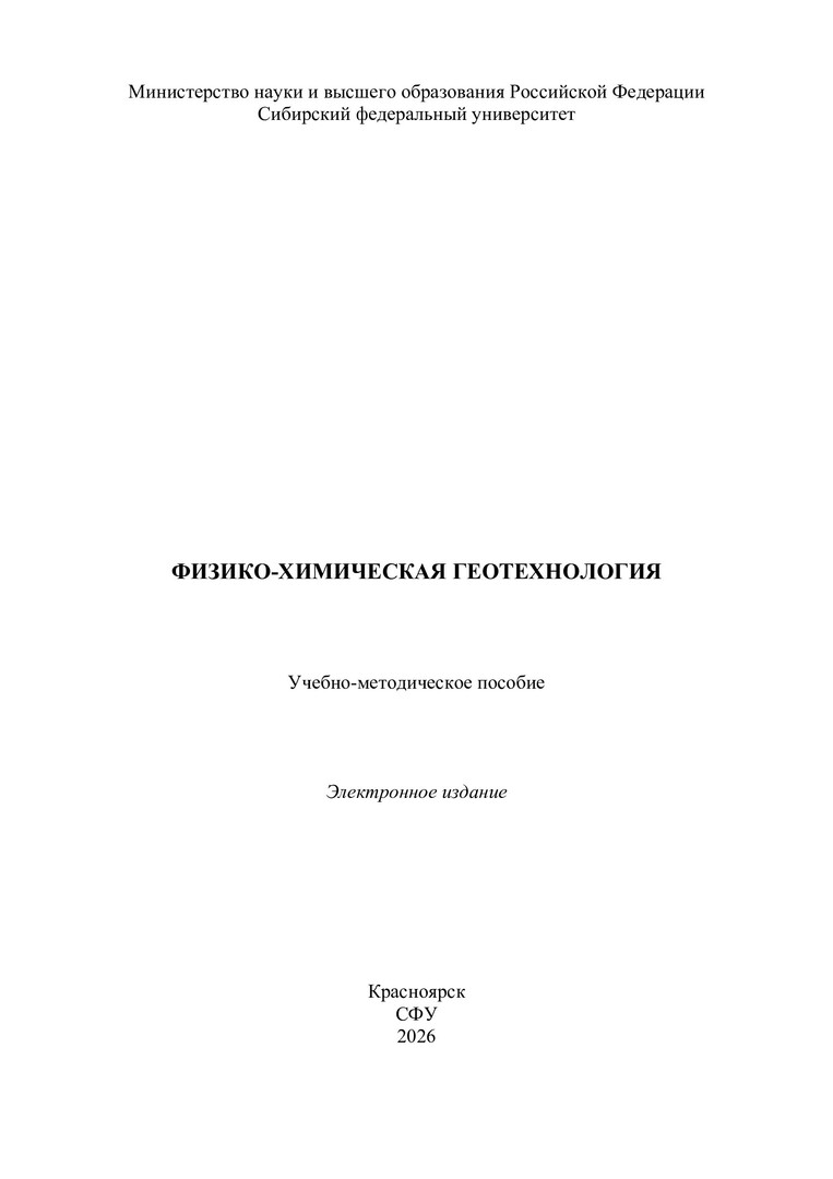 Библиографическое описание: Физико-химическая геотехнология : учебно-методическое пособие / Сибирский федеральный университет, Институт цветных металлов ; сост.: Б. А. Ахпашев, А. Н. Анушенков, Е. Г. Малиновский, Н. А. Шкаруба. - Электрон. текстовые дан. (pdf, 4.5 Мб). - Красноярск : СФУ, 2026 (2026-02-16). - 63 с. : рис., табл. - Загл. с титул. экрана. - Библиогр.: с. 62-63. - Изд. № 2026-26124 : Б. ц. - Текст : электронный.
