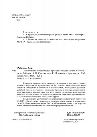 Библиографическое описание: Рябинин, Александр Александрович. Материалы в нефтегазовой промышленности : учебное пособие / А. А. Рябинин, А. Н. Сокольников, Р. Ш. Аюпов ; рец.: С. А. Куцевалов, А. В. Головков ; Сибирский федеральный университет, Институт нефти и газа. - Электрон. текстовые дан. (pdf, 11,9 Мб). - Красноярск : СФУ, 2024 (2024-09-13). - 128 с., 8.0 усл. печ. л. : ил., цв. ил. - Загл. с титул. экрана. - Электрон. версия печ. публикации . - Библиогр.: с. 125-. - ISBN 978-5-7638-4863-2 : Б. ц. - Изд. № 2023-19580. - Текст : электронный.