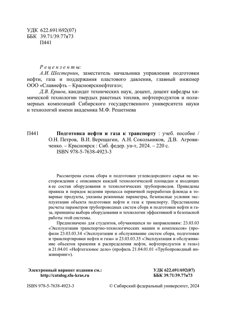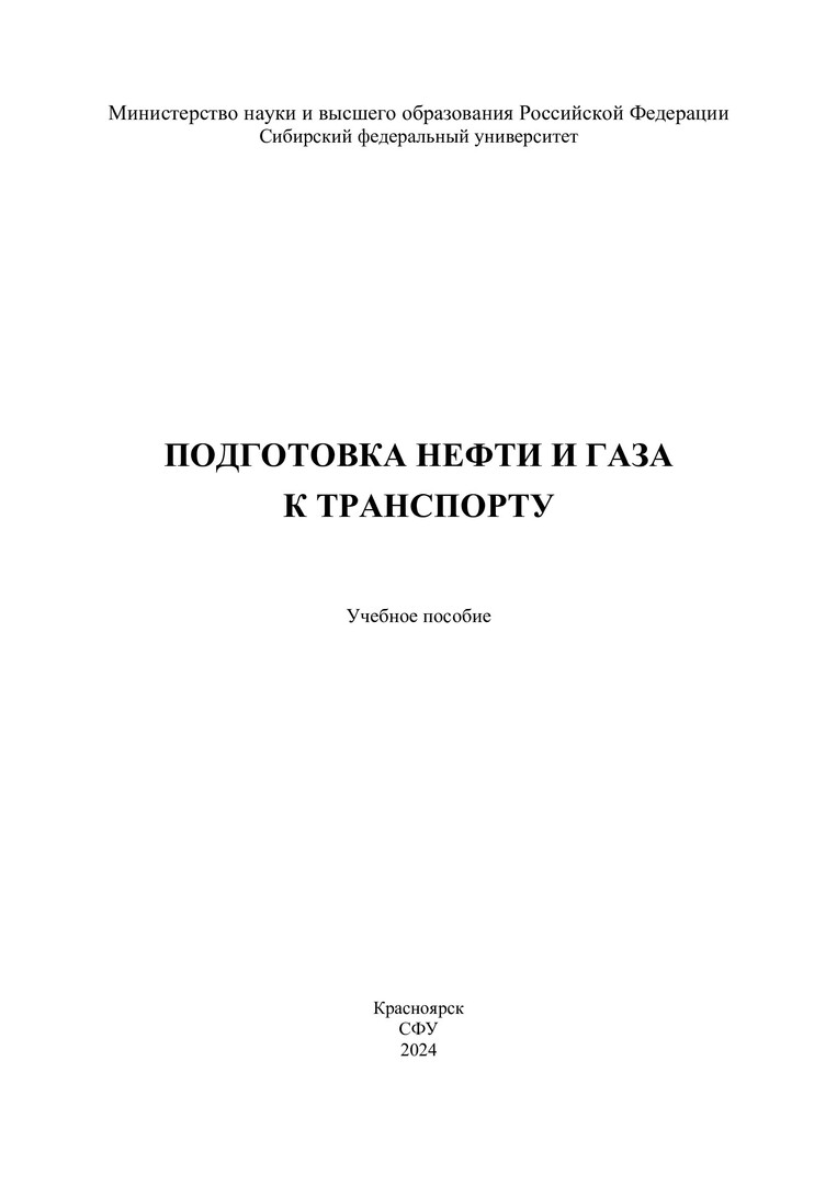 Библиографическое описание: Подготовка нефти и газа к транспорту : учебное пособие / О. Н. Петров, А. Н. Сокольников, В. И. Верещагин, Д. В. Агровиченко ; рец.: А. И. Шестернин, Д. В. Ершов ; Сибирский федеральный университет, Институт нефти и газа. - Электрон. текстовые дан. (1,8 Мб). - Красноярск : СФУ, 2024 (2024-05-27). - 220 с., 13.8 усл. печ. л. - Загл. с титул. экрана. - Электрон. версия печ. публикации . - Библиогр.: с. 212-214. - 100 экз. - ISBN 978-5-7638-4923-3 : Б. ц. - Изд. № 2023-20671. - Текст : электронный.