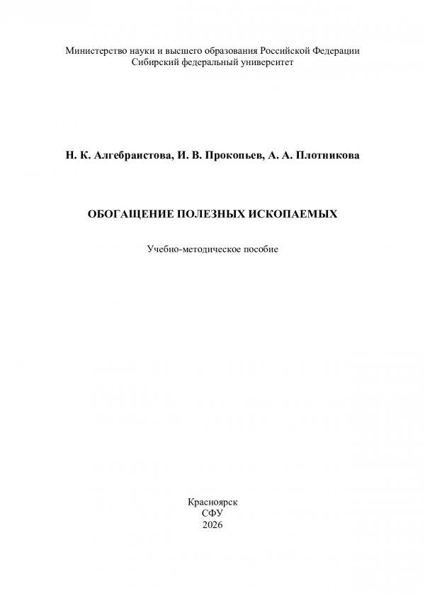 Библиографическое описание: Алгебраистова, Наталья Константиновна. Обогащение полезных ископаемых : [лабораторный практикум] : учебно-методическое пособие / Н. К. Алгебраистова, И. В. Прокопьев, А. А. Плотникова ; Сибирский федеральный университет, Институт цветных металлов. - Электрон. текстовые дан. (pdf, 1.8 Мб). - Красноярск : СФУ, 2026 (2026-01-15). - 104 с., 6.0 усл. печ. л. : граф., схемы, табл. - Загл. с титул. экрана. - Электрон. версия печ. публикации . - Библиогр.: с. 102. - 100 экз. - ISBN 978-5-7638-5201-1 : Б. ц. - Изд. № 2025-25735. - Текст : электронный.