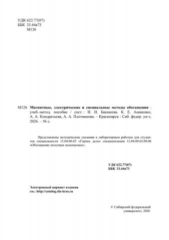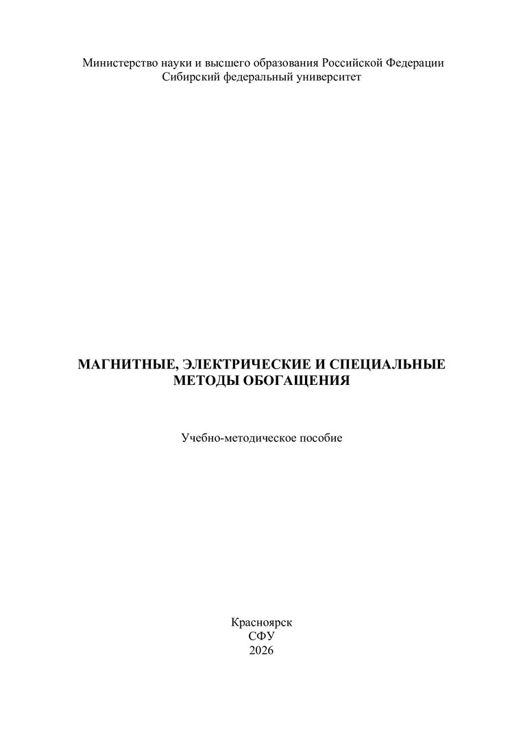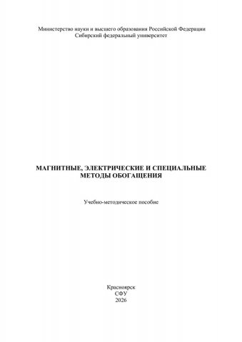 Библиографическое описание:Магнитные, электрические и специальные методы обогащения : учебно-методическое пособие / Сибирский федеральный университет ; сост.: И. И. Бакшеева, К. Е. Ананенко,А. А. Кондратьева, А. А. Плотникова. - Электрон. текстовые дан. (pdf, 2.7 Мб). - Красноярск : СФУ, 2026 (2026-02-17). - 56 с. : цв. ил., схемы, табл. - Загл. с титул. экрана. - Электрон. версия печ. публикации . - Библиогр.: с. 53. - 100 экз. - Изд. № 2026-26128 : Б. ц. - Текст : электронный.