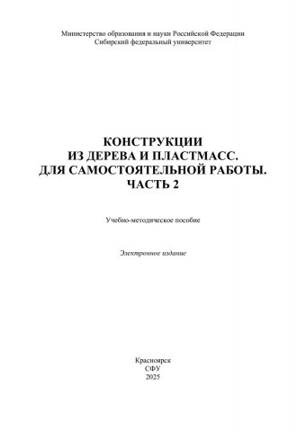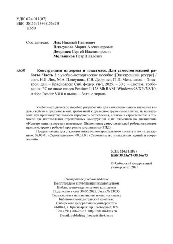 Библиографическое описание: Конструкции из дерева и пластмасс : учебно-методическое пособие для самостоятельной работы. Ч 2: учебно-методическое пособие / Сибирский федеральный университет, Инженерно-строительный институт ; сост.: Н. И. Лях, В. М. Плясунова, С. В. Деордиев, П. П. Мельников. - Электрон. текстовые дан. (pdf, 0,6 Мб). - Красноярск : СФУ, 2025. - 30 с. - Загл. с титул. экрана. - Библиогр.: с. 29-30. - Изд. № 2025-23635 : Б. ц. - Текст : электронный.