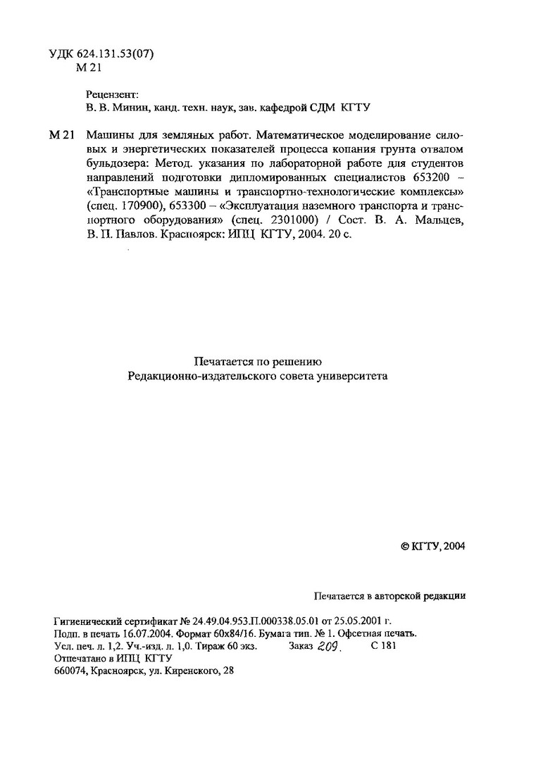Библиографическое описание:Мальцев, В. А. Машины для земляных работ. Математическое моделирование силовых и энергетических показателей процесса копания грунта отвалом бульдозера : метод. указ. по лаб. работе для студентов направлений подгот. дипломирован. спец. 653200, 653300 / В. А. Мальцев, В. П. Павлов ; Краснояр. гос. техн. ун-т. - Красноярск : ИПЦ КГТУ, 2004. - 20 с. : ил. - Библиогр.: с. 11-12. - Текст : непосредственный + Текст : электронный.